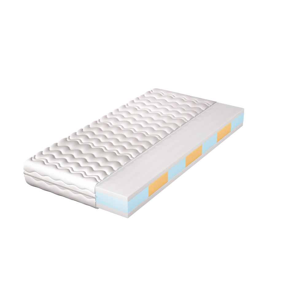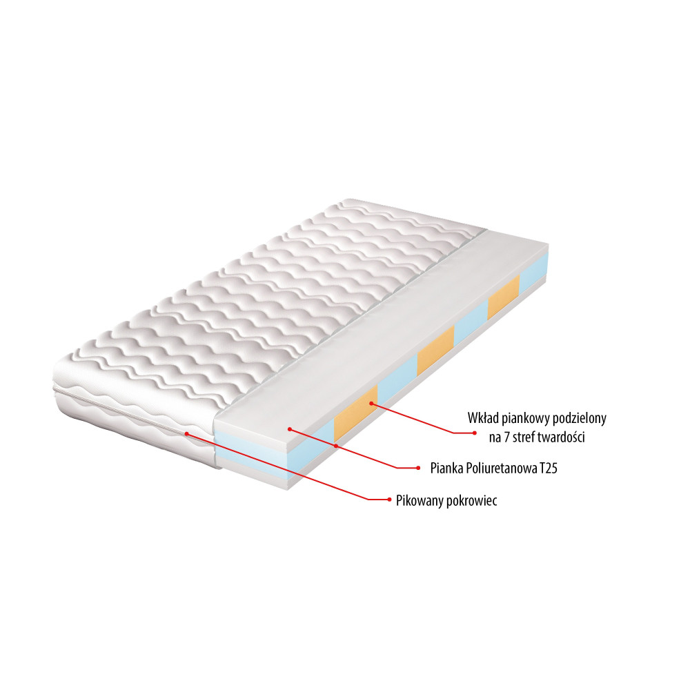 Materac wykonany z pianki, która została podzielona na 7 stref twardości. Każda ze stref ma specyficzną twardość, dostosowaną do różnych części ciała. Z dwóch stron znajduje się wkładka z pianki T25 o grubości 2 cm. Wysokość materaca: 15 cm.