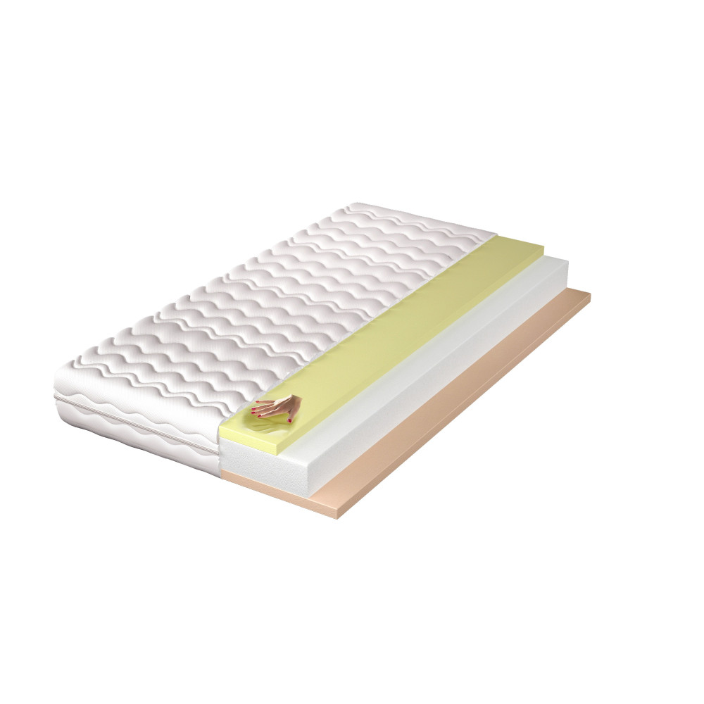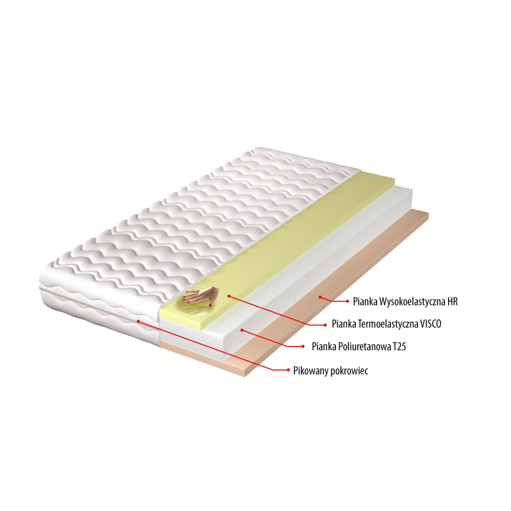 Materac wykonany z pianki T25, który został obłożony z jednej strony pianką wysokoelatyczną, która oferuje wsparcie dla kręgosłupa, zapewniając odpowiednią równowagę pomiędzy miękkością a sprężystością. Z drugiej strony znajduje się pianka visco, która dostosowuje się do kształtu ciała. Wysokość: 16 cm.