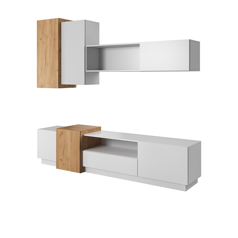 Drewniane naturalne akcenty przenikają i ocieplają biel, co sprawia, że wnętrze zyskuje niepowtarzalny charakter. Prosta, lecz oryginalna forma brył umożliwi ciekawą aranżację przestrzeni w każdym salonie.
