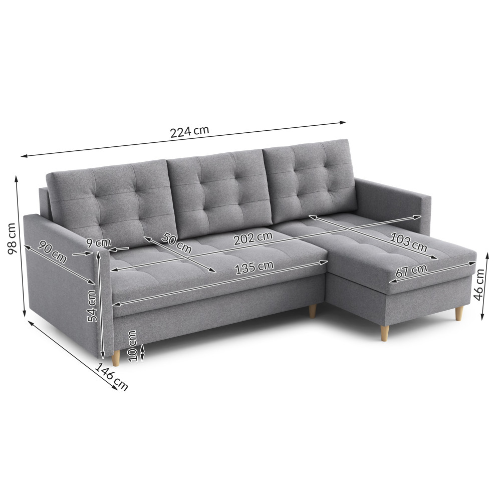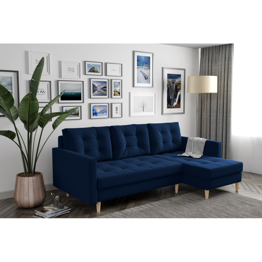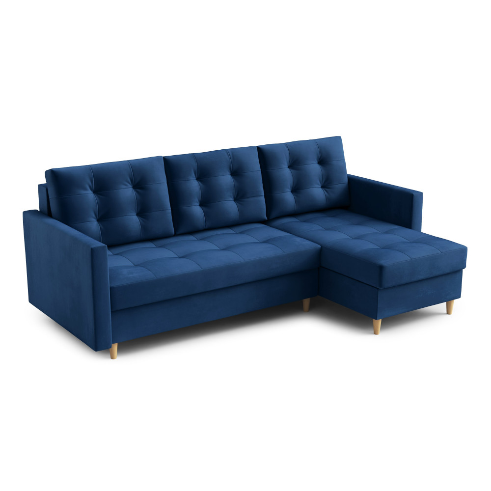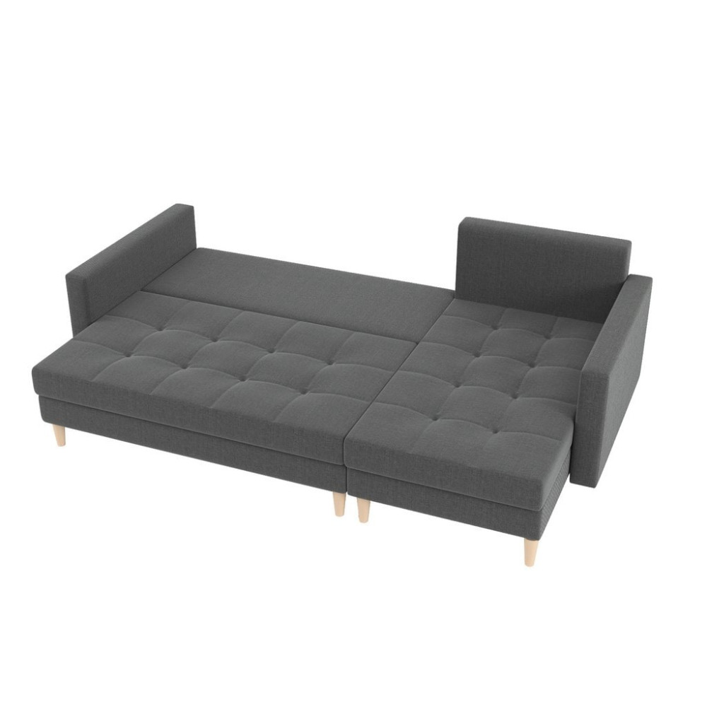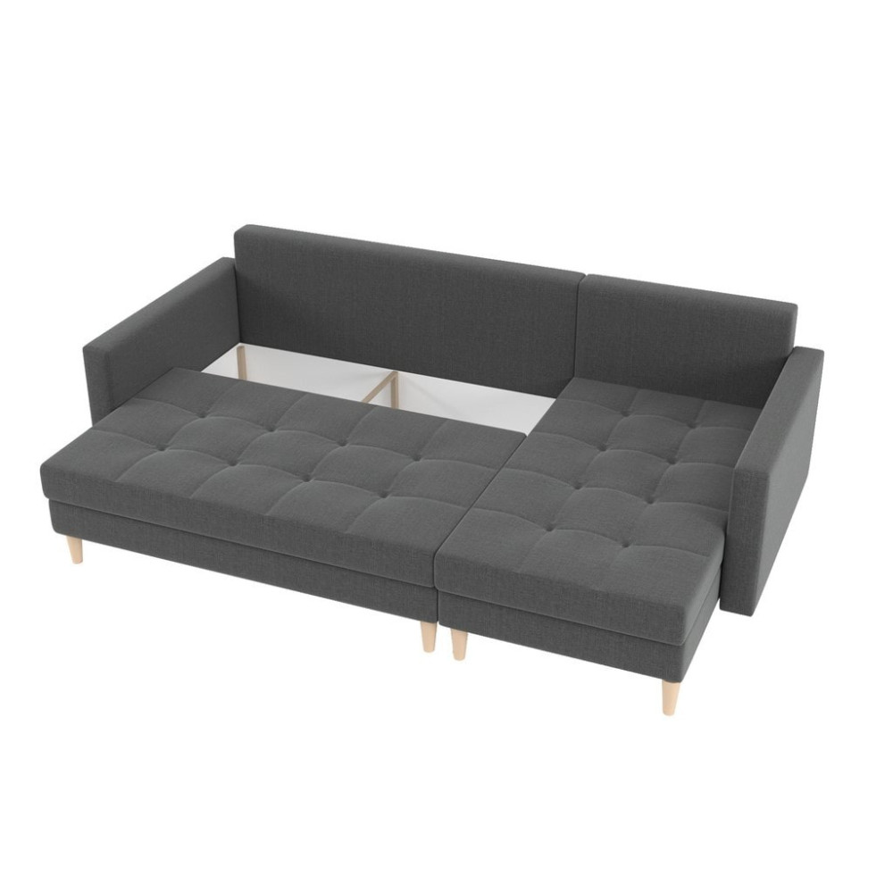 Narożnik Devi posiada również praktyczny pojemnik na pościel, co ułatwia przechowywanie dodatkowych kołder, poduszek czy pościeli. Drewniane nogi dodają meblowi solidności i stabilności.