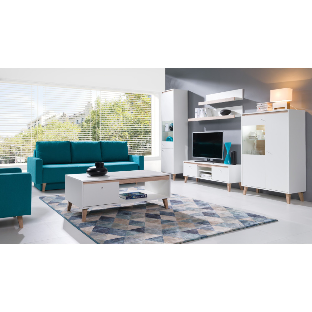 - Korpus i front w kolorze białym, a wstawki i nogi w motywie Dąb San Remo jasnym