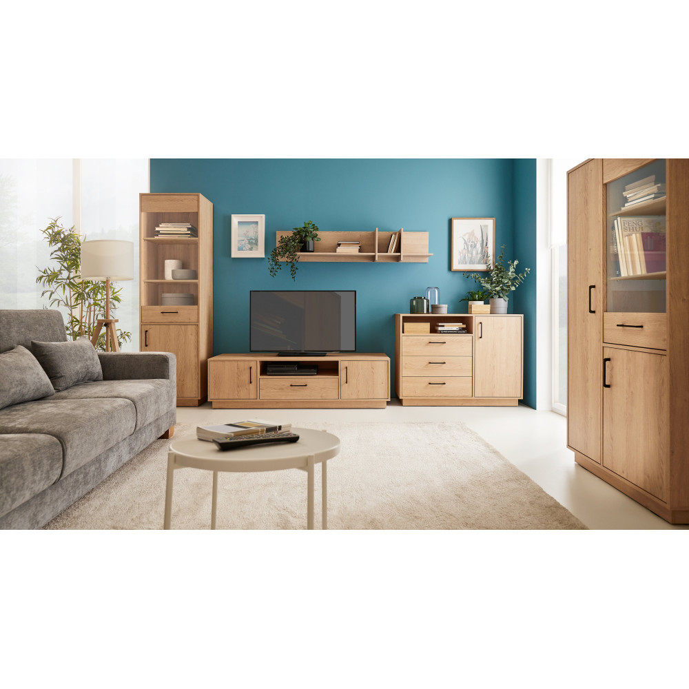 System meblowy Summer to kompleksowy zestaw mebli, który cechuje się nowoczesnym designem oraz wysoką funkcjonalnością. Głównym materiałem używanym do produkcji tych mebli jest płyta laminowana o odcieniach kolorystycznych Dąb Biszkoptowy lub Dąb Biszkoptowy/Biały.
