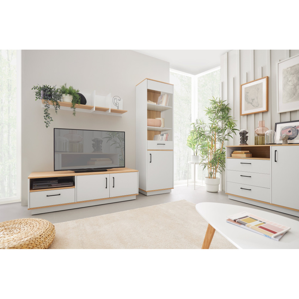 System meblowy Summer to kompleksowy zestaw mebli, który cechuje się nowoczesnym designem oraz wysoką funkcjonalnością. Głównym materiałem używanym do produkcji tych mebli jest płyta laminowana o odcieniach kolorystycznych Dąb Biszkoptowy lub Dąb Biszkoptowy/Biały.