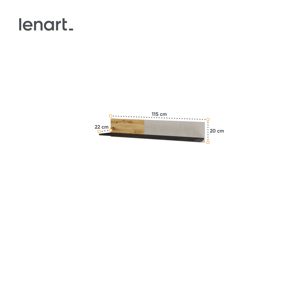 Nowoczesna półka wisząca to doskonałe połączenie stylu i funkcjonalności. Idealnie sprawdzi się jako miejsce na książki, dekoracje lub inne drobiazgi, pomagając w organizacji przestrzeni. Wykonana w eleganckim odcieniu dębu artisan, harmonijnie współgra z ciemnymi elementami inspirowanymi surową stalą, dodając wnętrzu nowoczesnego charakteru. Półka wyróżnia się prostą, geometryczną formą, która idealnie wpasuje się w nowoczesne aranżacje, a jej praktyczny design umożliwia łatwe przechowywanie i eksponowanie ulubionych przedmiotów.