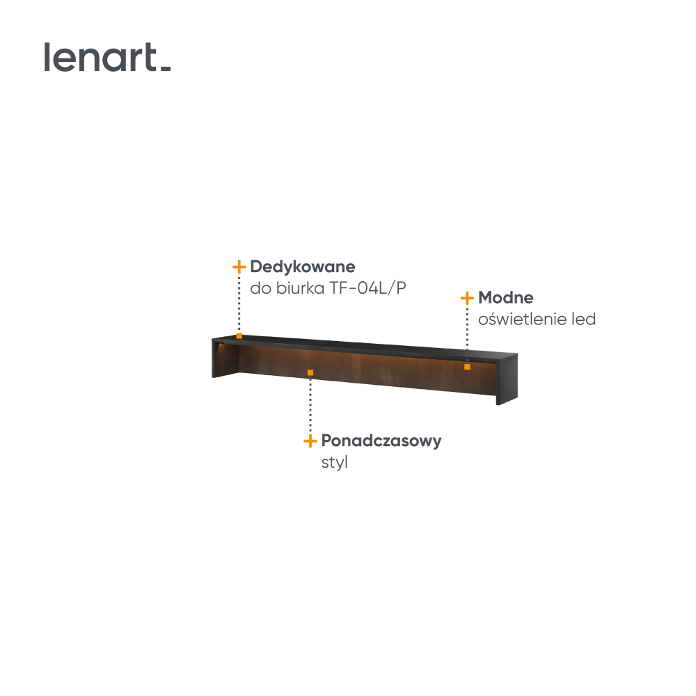 Nadstawka wyposażona jest w wbudowane oświetlenie w pomarańczowym odcieniu, które tworzy przyjemną atmosferę i dodaje wnętrzu ciepła. Idealnie komponuje się z nowoczesnym stylem pokoju młodzieżowego, podkreślając industrialny charakter mebla. W połączeniu z biurkiem tworzy spójną i praktyczną przestrzeń do nauki, pracy i przechowywania, stanowiąc stylowy element wyposażenia nowoczesnego wnętrza.