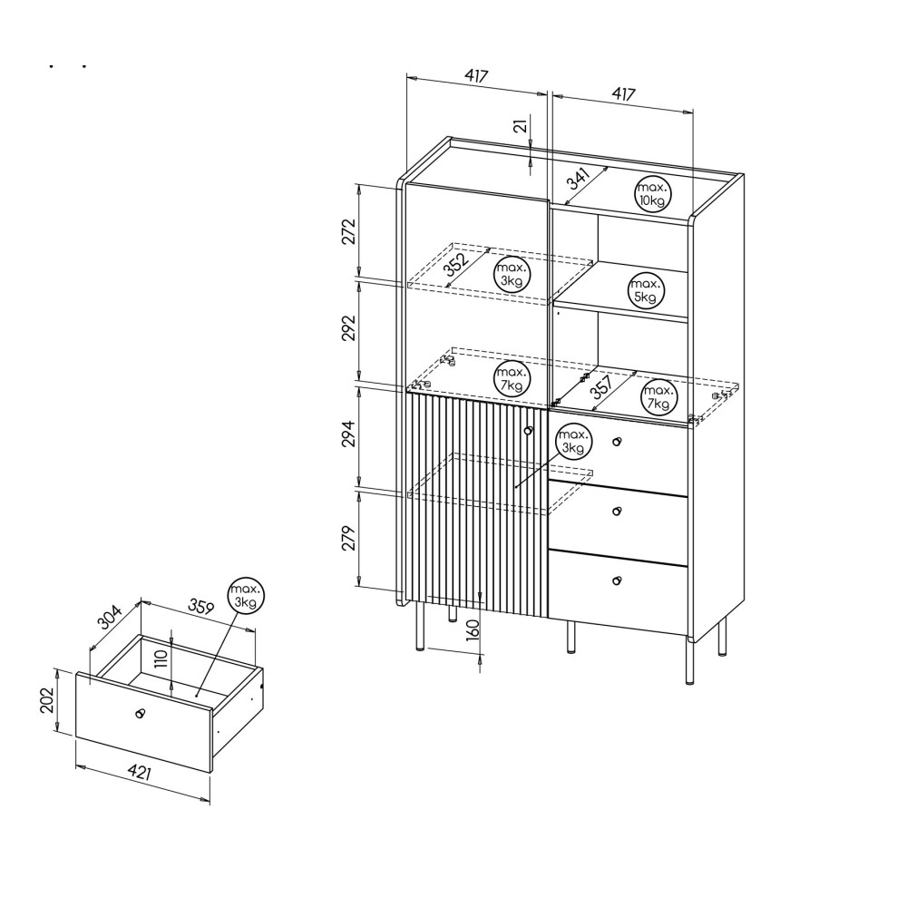 • Fronty wykonane z trwałej płyty MDF o grubości 16 mm oraz laminowanej płyty wiórowej o grubości 16 mm