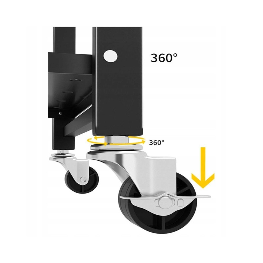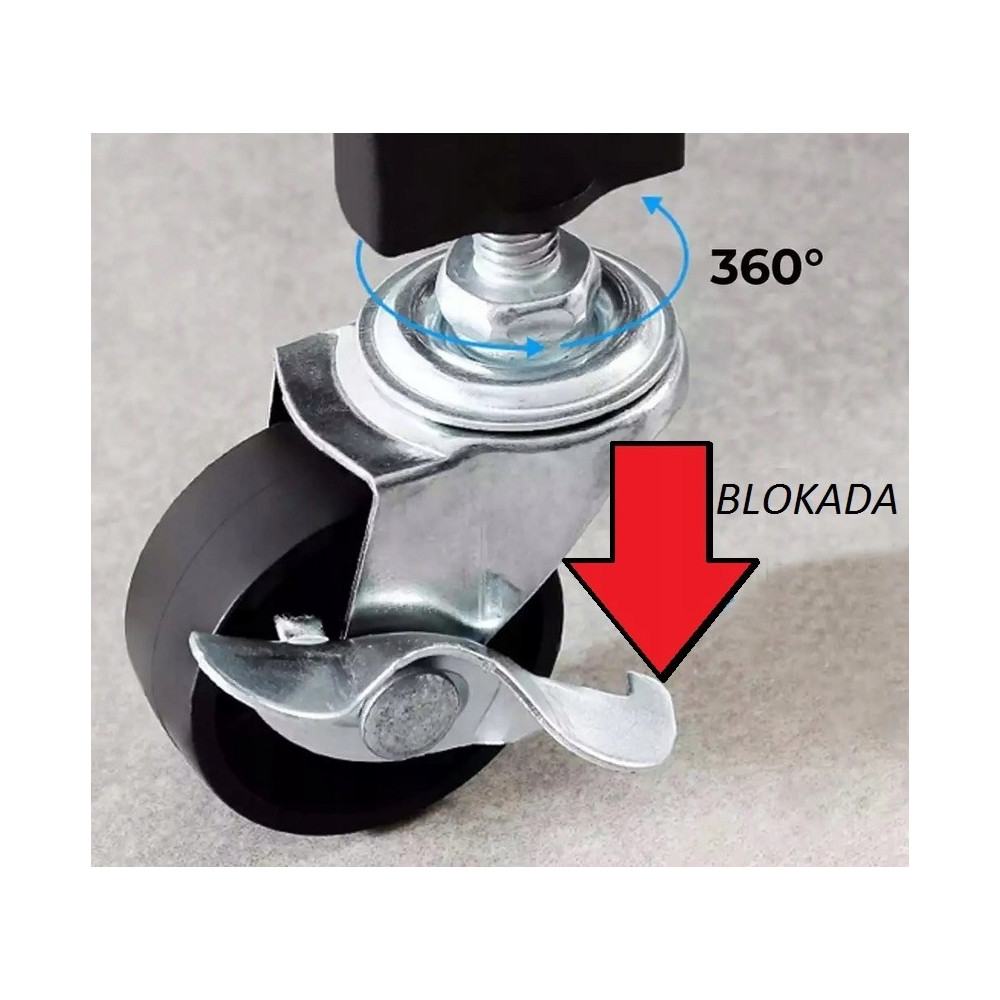Regał posiada 4 kółka obracające się o 360 stopni, a dodatkowo 2 z nich posiadają specjalną blokadę, która uniemożliwia samowolne przesunięcie regału.