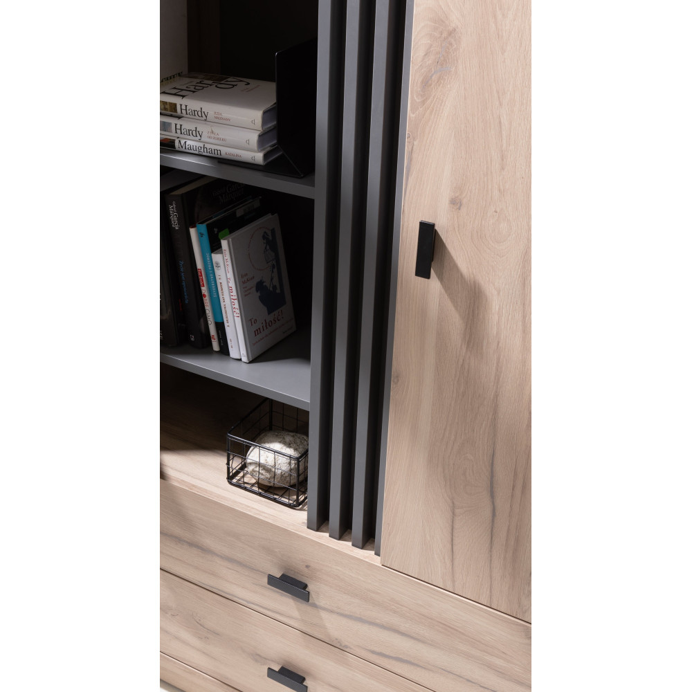 System meblowy Alikante to kompleksowy zestaw mebli, który cechuje się nowoczesnym designem oraz wysoką funkcjonalnością. Głównym materiałem używanym do produkcji tych mebli jest płyta laminowana o odcieniach kolorystycznych Dąb Estana Jasny oraz elegancki Antracyt.