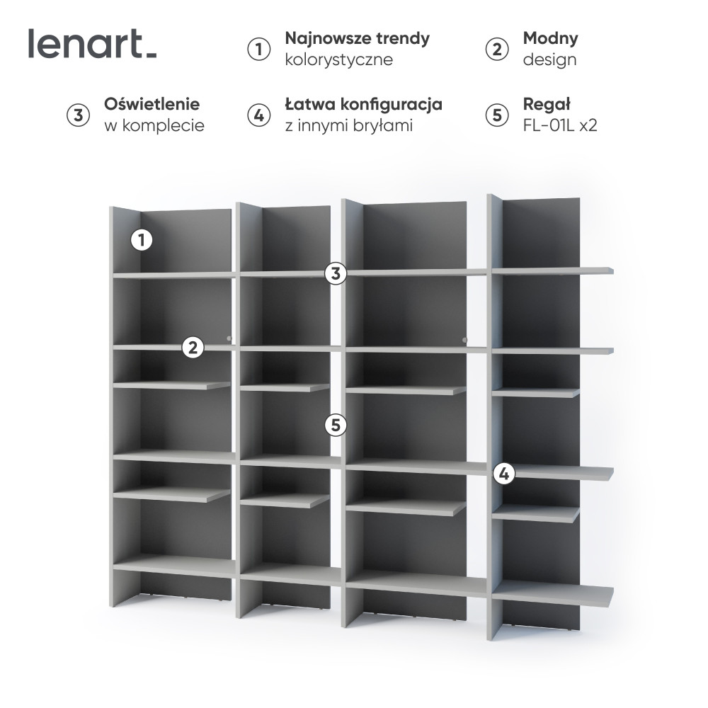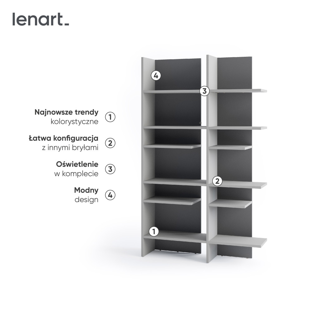 Nowoczesny i designerski regał otwarty to idealne rozwiązanie do salonu, sypialni, domowego biura czy korytarza. Jego otwarta konstrukcja zapewnia łatwy dostęp do przechowywanych rzeczy, co ułatwia organizację i pozwala szybko odnaleźć potrzebne przedmioty. W komplecie jest również oświetlenie. Funkcjonalność regału idzie w parze z trwałością – wykonany z solidnych materiałów, będzie służył przez wiele lat, pozostając odpornym na uszkodzenia. Regał został wykonany w kolorach metalic ciemny i jasny.