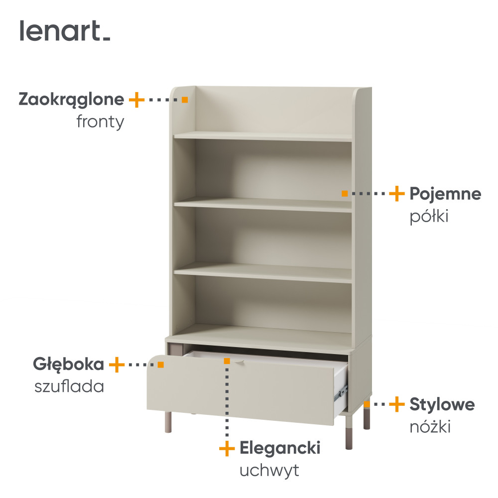 Regał HR-02 to funkcjonalny i stylowy mebel, idealny do pokoju nastolatki. Wyposażony w pojemne półki, umożliwia wygodne przechowywanie książek czy dekoracji. Dodatkowo posiada praktyczną szufladę na drobiazgi, które warto mieć pod ręką. Wykonany w eleganckim połączeniu kolorów kaszmir i trufla, regał harmonijnie wpisuje się w nowoczesne wnętrza. Zaokrąglone krawędzie nadają mu delikatny, przyjazny wygląd, a przemyślany układ półek zapewnia optymalne zagospodarowanie przestrzeni.