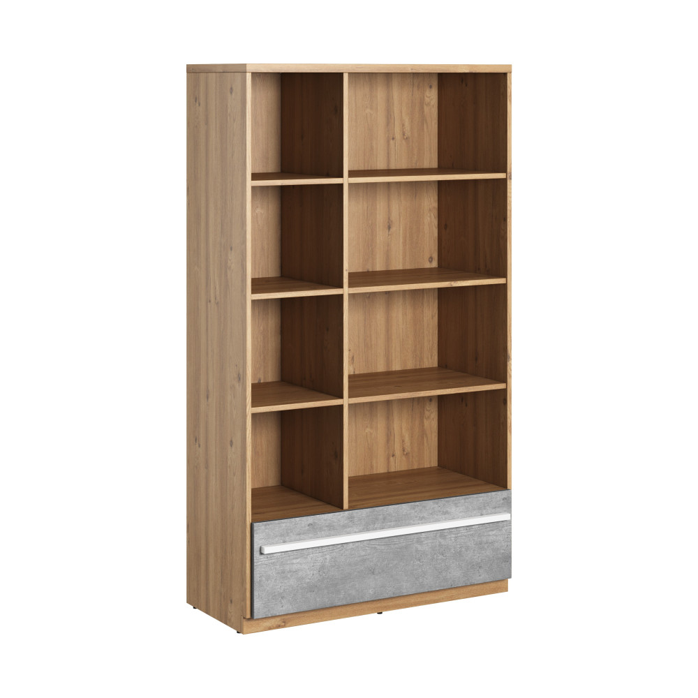 Smukły regał w nowoczesnym stylu, utrzymany w eleganckiej kolorystyce dąb nash, bieli i szarego betonu, idealnie wpasuje się zarówno do pokoju dziewczęcego, jak i chłopięcego. Otwarty układ półek pozwala na wyeksponowanie ulubionych książek, zabawek czy dekoracji, a szeroka i pojemna szuflada na dole zapewnia dodatkowe miejsce do przechowywania. Dzięki starannemu wykonaniu oraz nowoczesnemu designowi, regał jest nie tylko funkcjonalny, ale też stanowi stylowy element wnętrza.