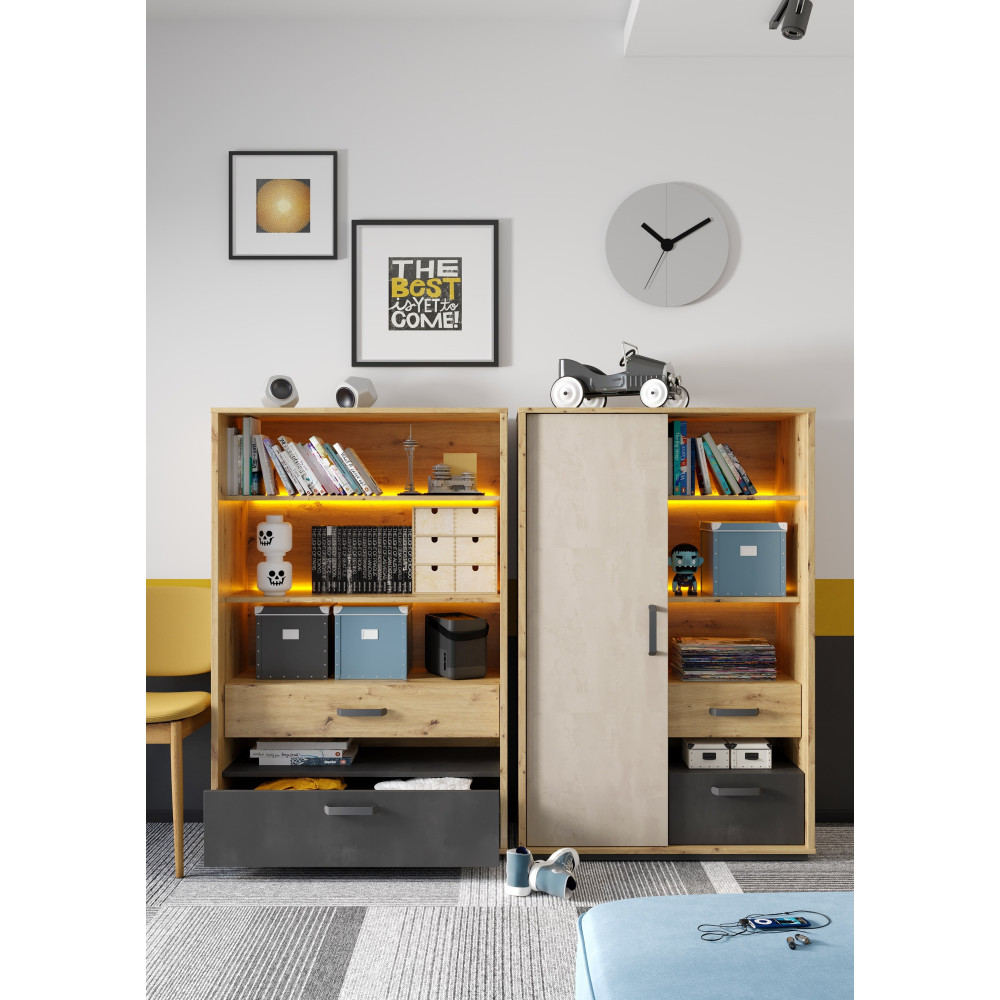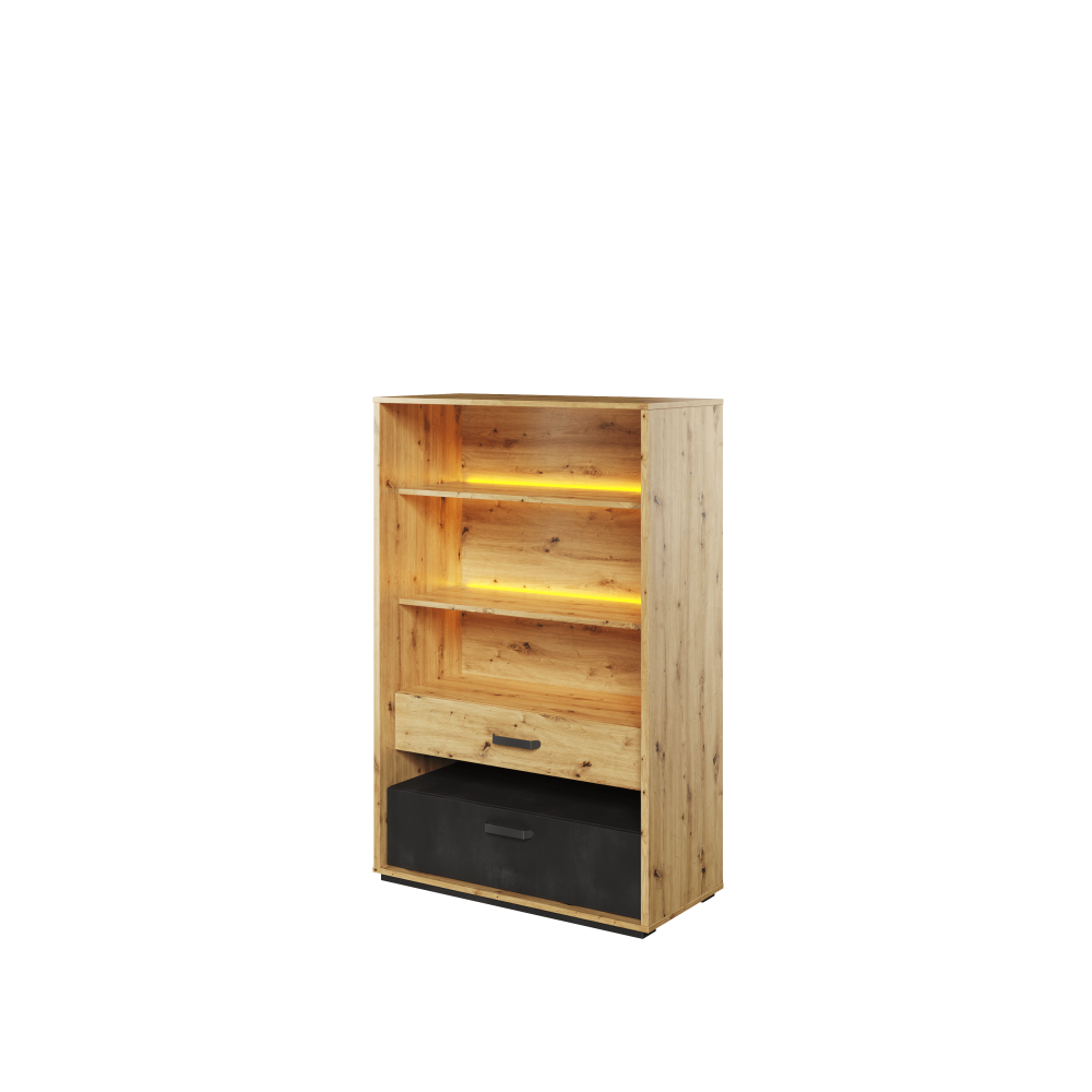 Średniej wysokości regał łączy nowoczesny design z praktycznymi rozwiązaniami, zachwycając elegancką kolorystyką. Został wykończony w ciepłym odcieniu dębu artisan, który harmonijnie kontrastuje z ciemnymi elementami o wyglądzie surowej stali. Regał wyposażono w dwie szuflady, idealne do przechowywania drobiazgów, oraz trzy wysokie półki na książki, akcesoria szkolne i inne przedmioty. Między szufladami znajduje się otwarta wnęka, która doskonale sprawdzi się jako miejsce na różne drobiazgi. Całość podkreślają stylowe, metalowe uchwyty oraz niskie podpory, a w zestawie znajduje się oświetlenie LED, dodające nowoczesnego charakteru i funkcjonalności.