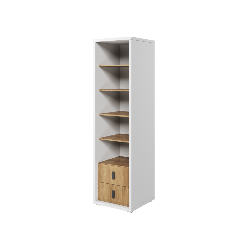 Elegancki regał, który harmonijnie łączy funkcjonalność z nowoczesnym stylem. Wysoka konstrukcja z pięcioma półkami zapewnia mnóstwo miejsca na książki, dekoracje i inne przedmioty, umożliwiając swobodne aranżowanie przestrzeni. Na dole znajdują się dwie pojemne i łatwo dostępne szuflady, które doskonale sprawdzą się do przechowywania drobiazgów, dbając o porządek w każdym wnętrzu.