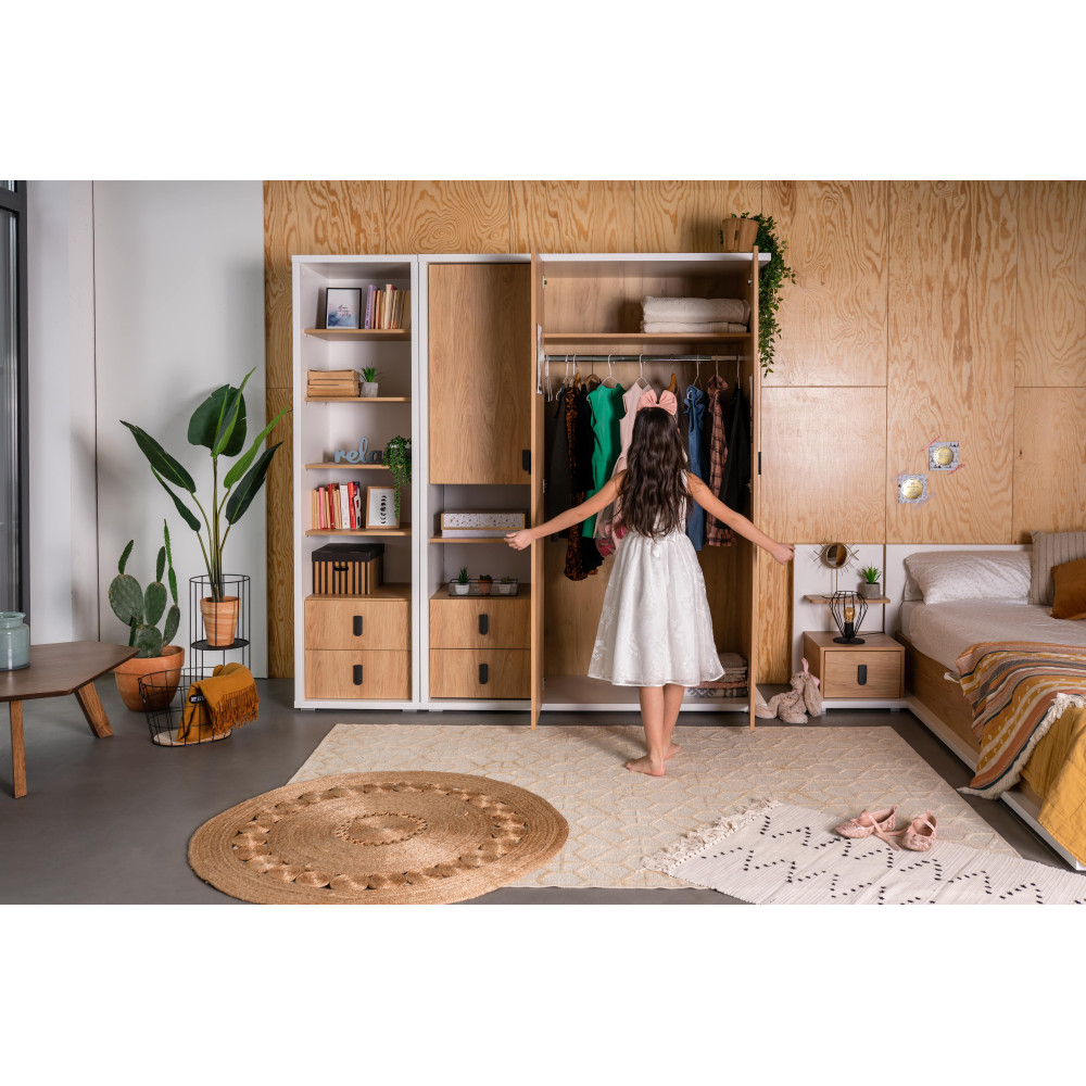 Ponadczasowe zestawienie bieli i dekoru o ciepłej barwie drewna hikora nadaje regałowi przytulny charakter, wprowadzając harmonię do każdego pomieszczenia. Subtelne detale oraz staranne wykonanie sprawiają, że regał nie tylko spełnia swoje funkcje, ale także staje się stylowym akcentem, który wzbogaca aranżację wnętrza.
