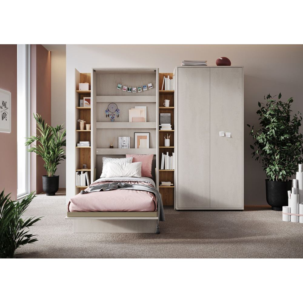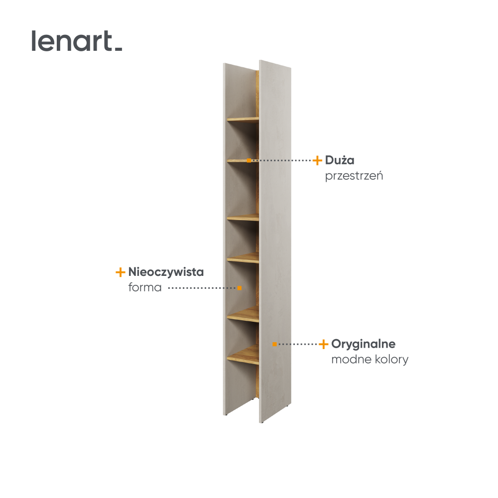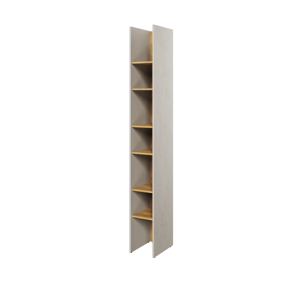 Wąski regał na książki, wykonany w kolorze dębu hikora i szarości, to stylowe i funkcjonalne rozwiązanie do nowoczesnych wnętrz. Smukła forma oraz kompaktowe wymiary sprawiają, że regał idealnie sprawdzi się w mniejszych przestrzeniach, takich jak salon, sypialnia czy domowe biuro, oferując miejsce na książki, dekoracje lub drobne akcesoria.