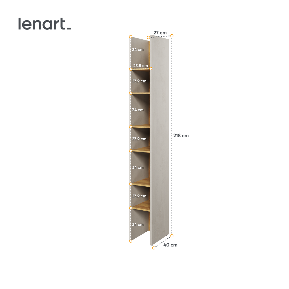 Regał wyposażony jest w sześć otwartych półek, które nadają mu lekkości i pozwalają łatwo organizować oraz eksponować ulubione przedmioty. Kontrastowe połączenie ciepłego odcienia dębu hikora z szarością tworzy nowoczesny, a jednocześnie przytulny efekt, który wzbogaci wnętrze. Solidna konstrukcja zapewnia trwałość i odporność na codzienne użytkowanie, dzięki czemu regał stanowi idealne uzupełnienie zarówno nowoczesnych, jak i klasycznych aranżacji wnętrz.