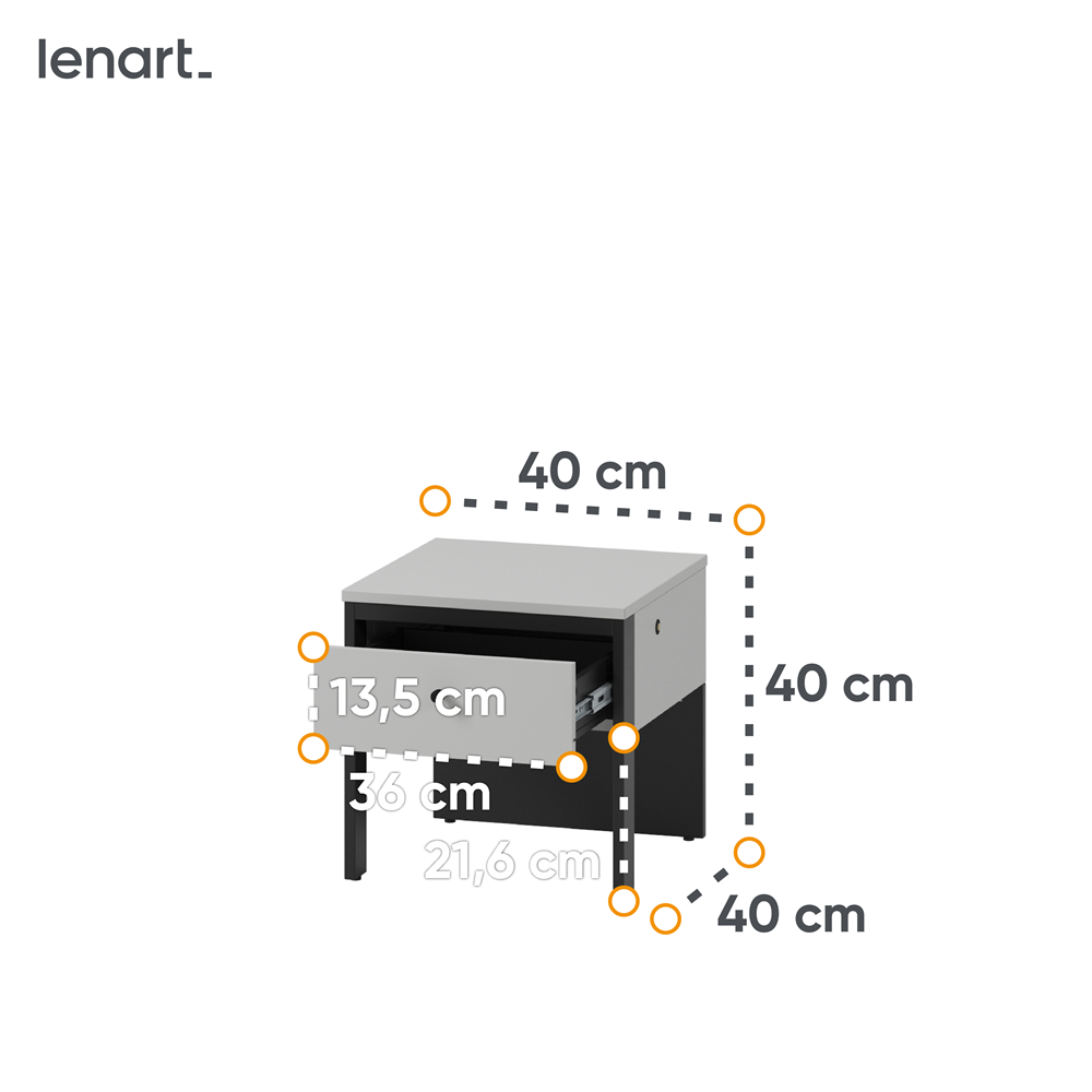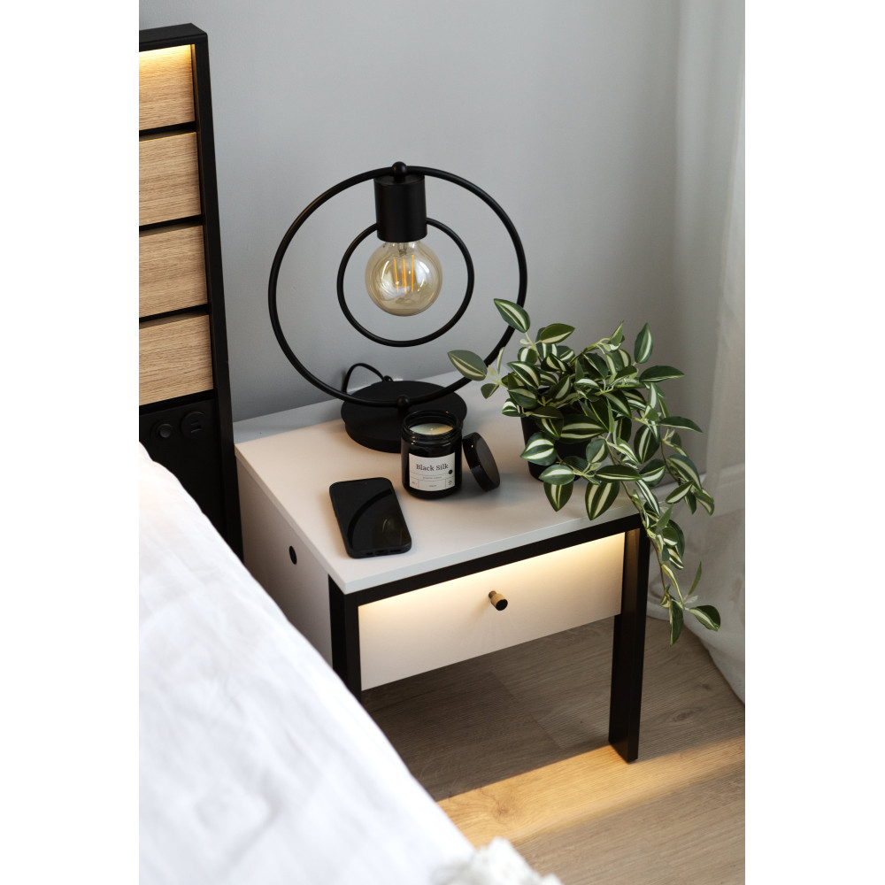 Nowoczesny stolik nocny wyposażony jest w pojedynczą szufladę z subtelnymi, okrągłymi uchwytami w czarnym kolorze oraz zintegrowane oświetlenie LED, które tworzy przyjemną atmosferę. Jego konstrukcja opiera się na dwóch smukłych przednich nogach, a tył wspiera dodatkowa, czarna płyta, zapewniająca stabilność. Doskonały do przechowywania drobiazgów, które chcesz mieć pod ręką w czasie nocy, łącząc stylowy design z praktycznym rozwiązaniem.