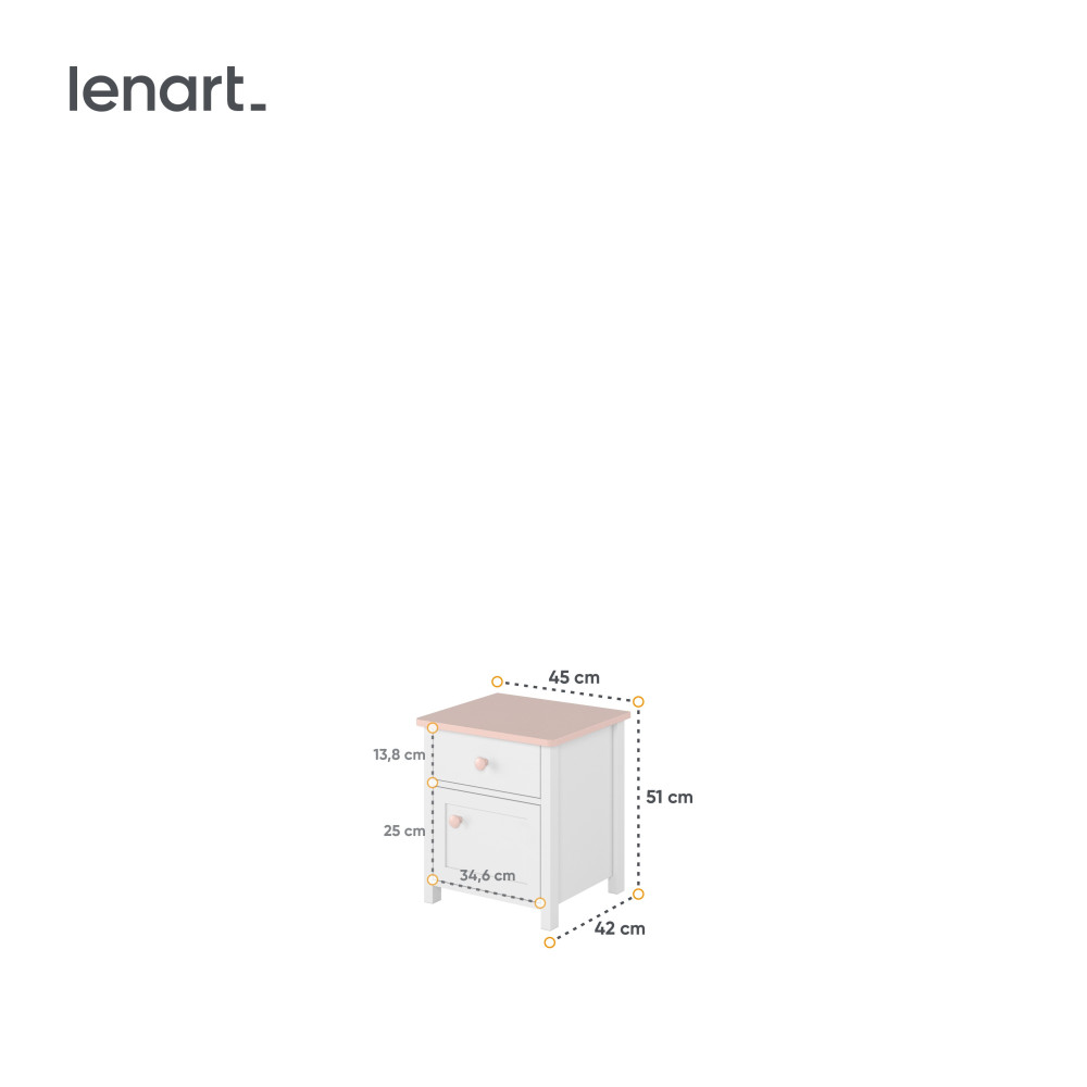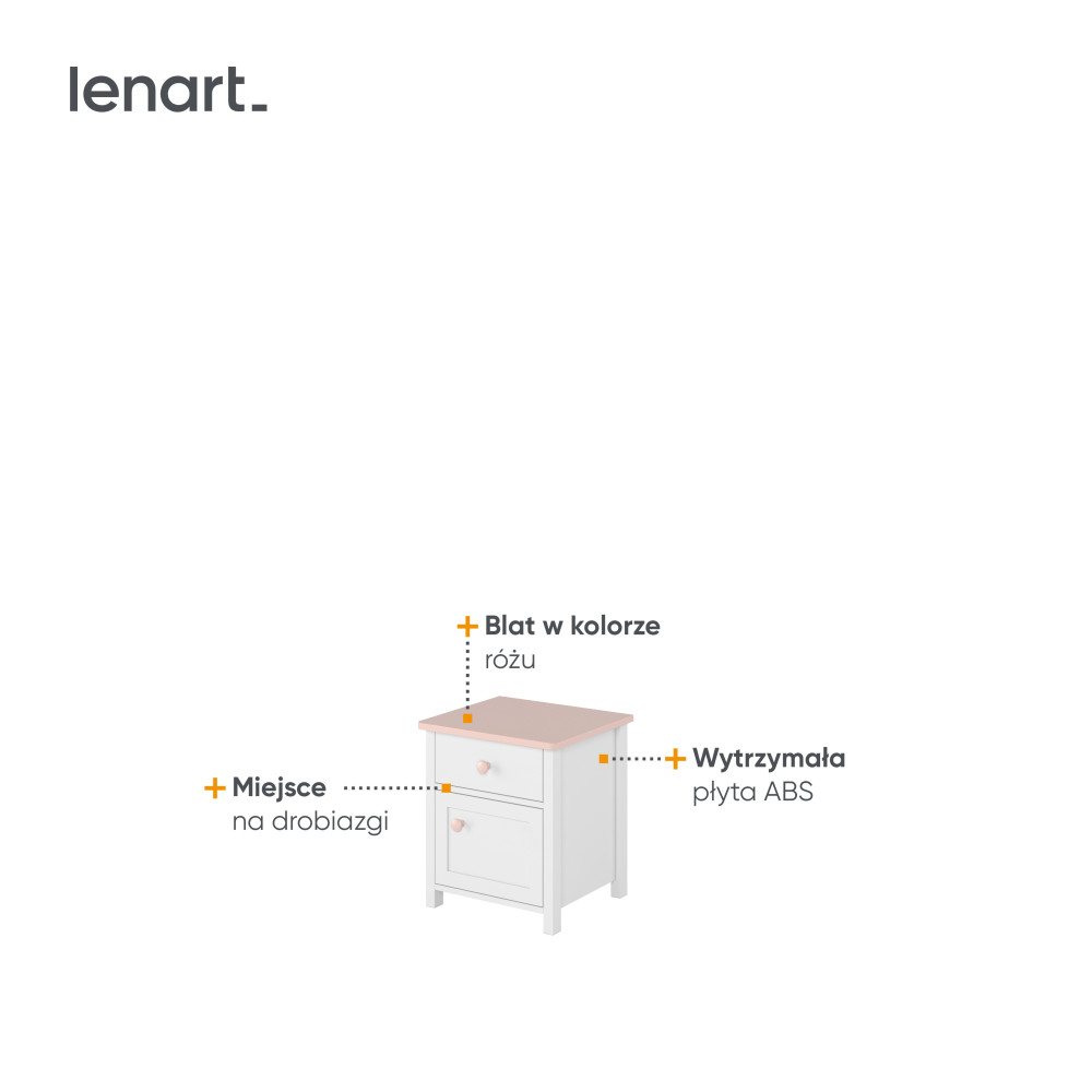Stolik nocny w kolorze alpejskiej bieli z różowym blatem to uroczy dodatek do romantycznych wnętrz. Wyposażony w szufladę oraz szafę, zapewnia wygodne miejsce na najpotrzebniejsze drobiazgi. Delikatne wykończenie i subtelna linia podkreślają jego lekki, elegancki styl.