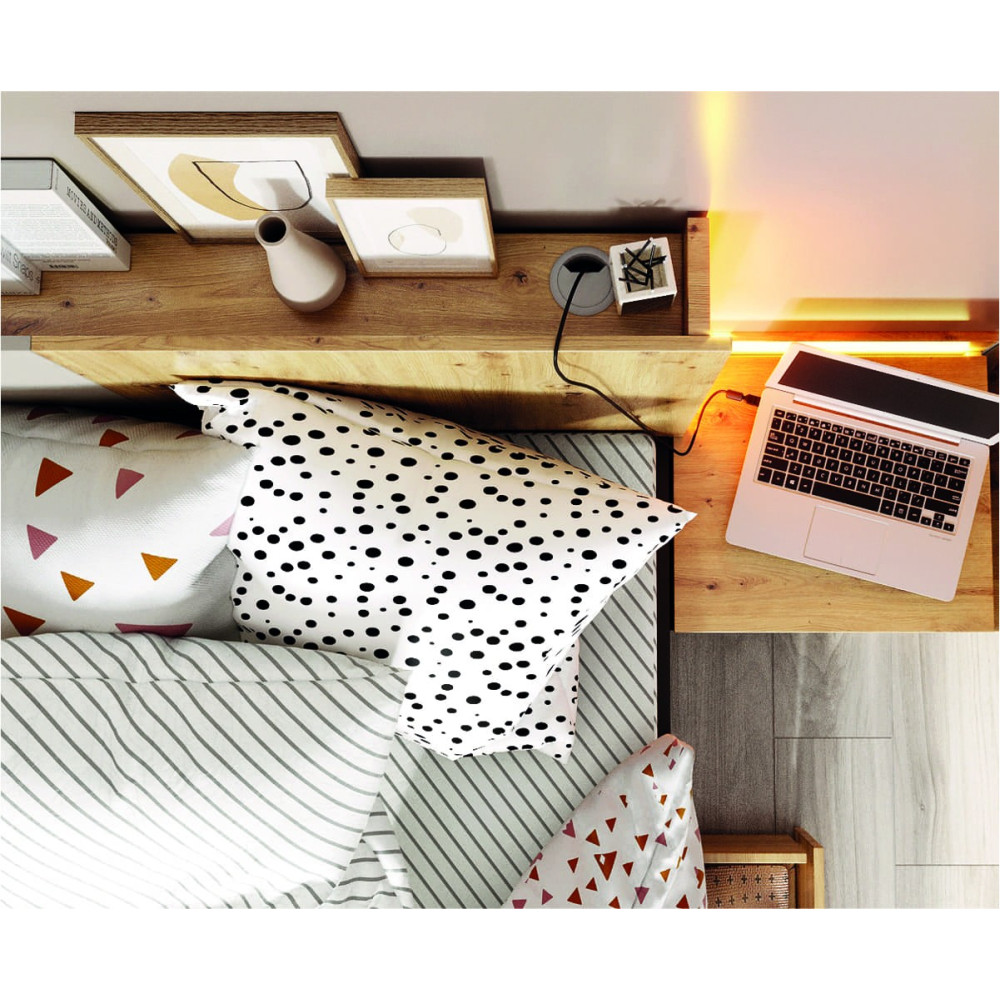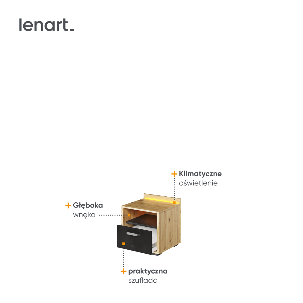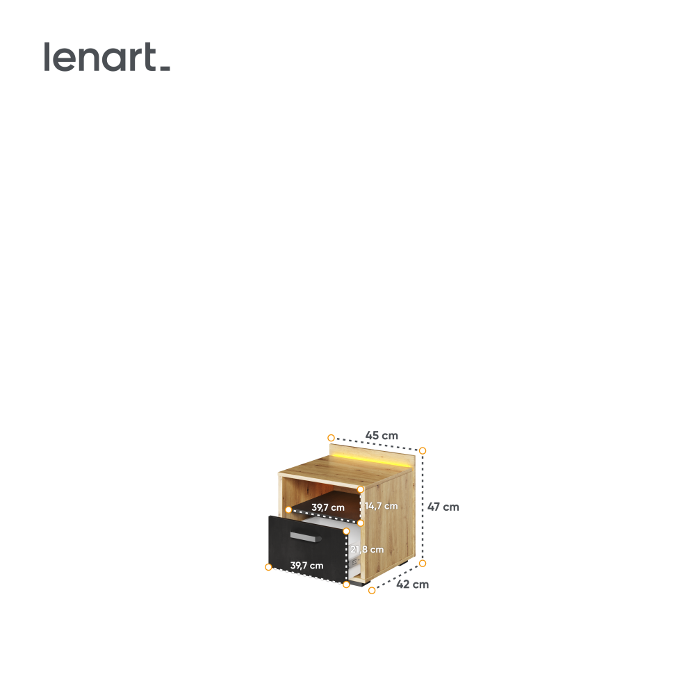 Funkcjonalny stolik nocny w nowoczesnej estetyce. Posiada dużą szufladę i otwartą wnękę, które zapewniają wygodne miejsce na przechowywanie ulubionych przedmiotów. Nietypowo cofnięty front szuflady oraz połączenie dekorów w dwóch kolorach: naturalnego drewna i surowej stali, tworzą unikalny efekt. Nowoczesny wygląd stolika podkreślają eleganckie metalowe uchwyty oraz niskie nóżki. W zestawie znajduje się także oświetlenie LED, które dodaje stylu. Stolik wykonano z solidnej płyty laminowanej, wykończonej trwałym obrzeżem ABS.