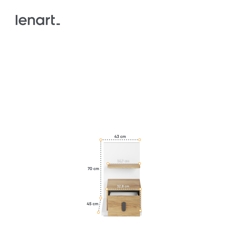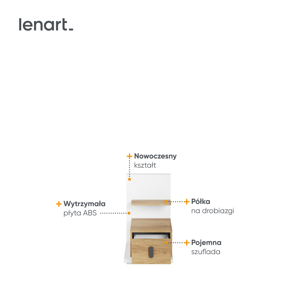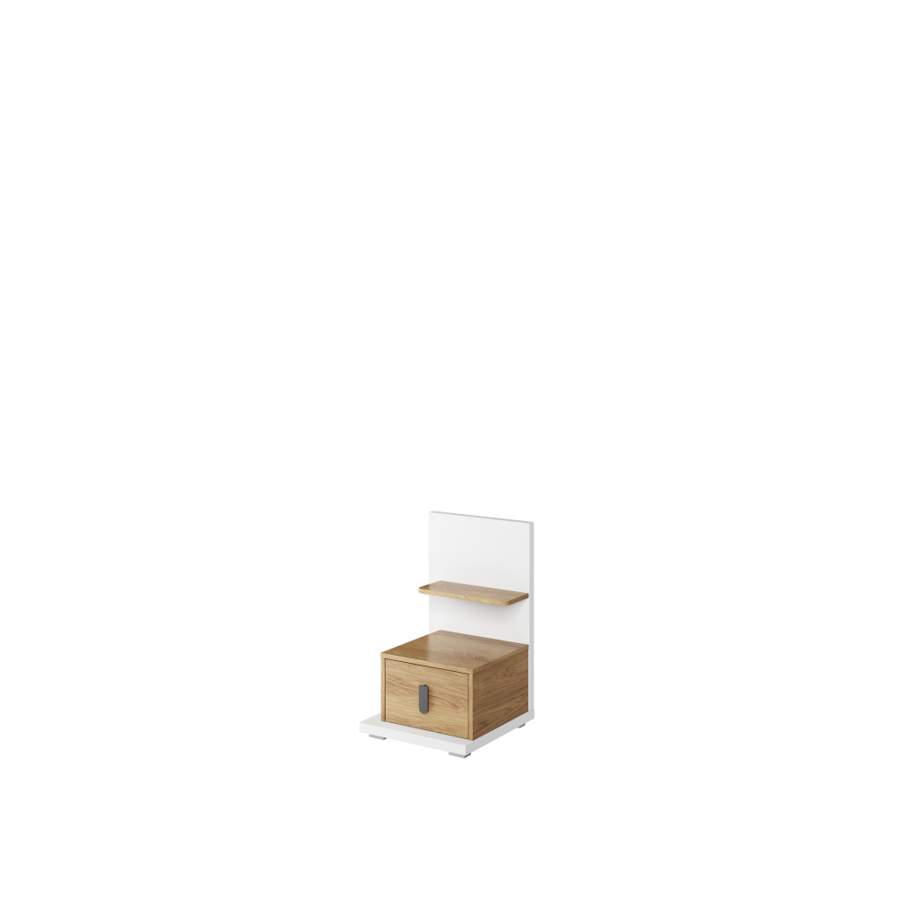 Elegancki stolik nocny o oryginalnym i nowoczesnym kształcie. Niewielka półka oraz blat szuflady umożliwiają wygodne odłożenie najpotrzebniejszych przedmiotów, co czyni go idealnym towarzyszem przy łóżku. Pojemna szuflada zapewnia łatwy dostęp do przechowywanych wewnątrz rzeczy, dbając o porządek w sypialni. Zestawienie bieli z ciepłym odcieniem drewna hikora nadaje stolikowi przytulny charakter, wprowadzając harmonię do każdej przestrzeni.
