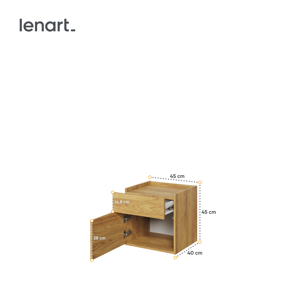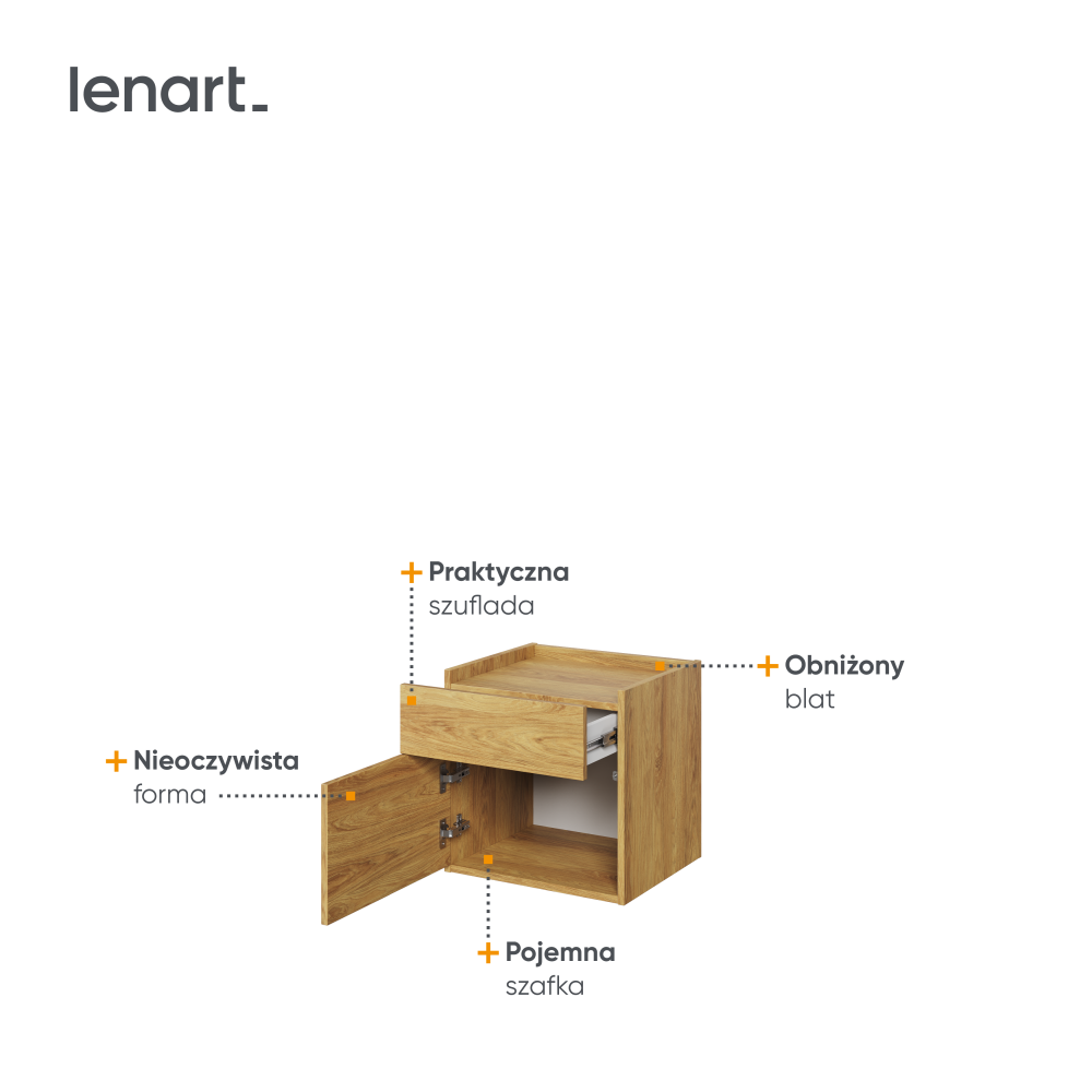 Stolik nocny w kolorze dąb hikora to stylowy i funkcjonalny element wyposażenia każdej sypialni. Wyposażony w pojemną szafkę i praktyczną szufladę, oferuje wiele miejsca na przechowywanie książek, ładowarek czy innych drobnych przedmiotów, pomagając utrzymać porządek przy łóżku. Obniżony blat dodaje mu wyjątkowego charakteru i doskonale nadaje się na lampkę nocną, budzik lub ulubione dekoracje, pozostając jednocześnie w zasięgu ręki. Ciepły odcień drewna dąb hikora w połączeniu z prostym designem sprawia, że stolik świetnie wpisuje się w różnorodne aranżacje wnętrz, dodając sypialni elegancji i przytulności.