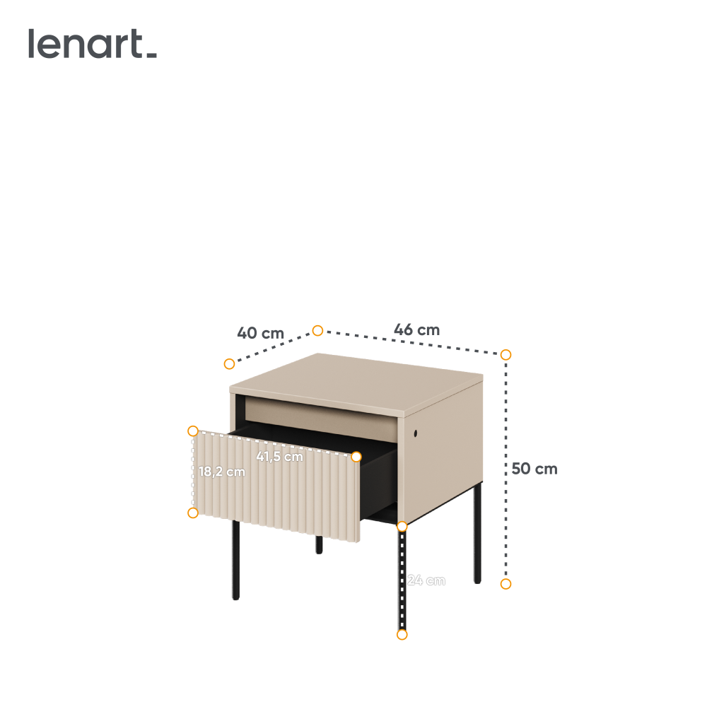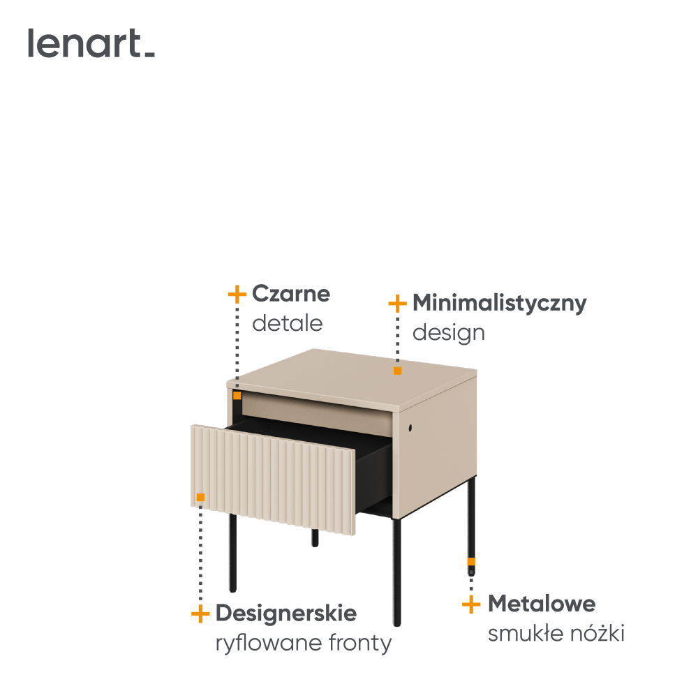 Beżowy stolik nocny z ryflowanym frontem to stylowy akcent, który przyciąga wzrok i dodaje wnętrzu wyjątkowego charakteru. Czarne detale podkreślają jego elegancki design, nadając mu nowoczesny, wyrafinowany wygląd. Smukłe, metalowe nóżki zapewniają konstrukcji lekkość oraz stabilność, idealnie komponując się z minimalistyczną formą mebla.