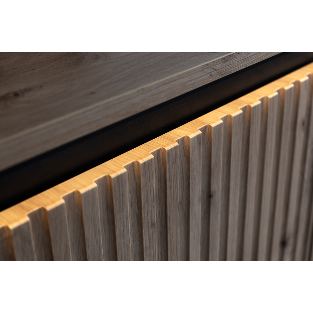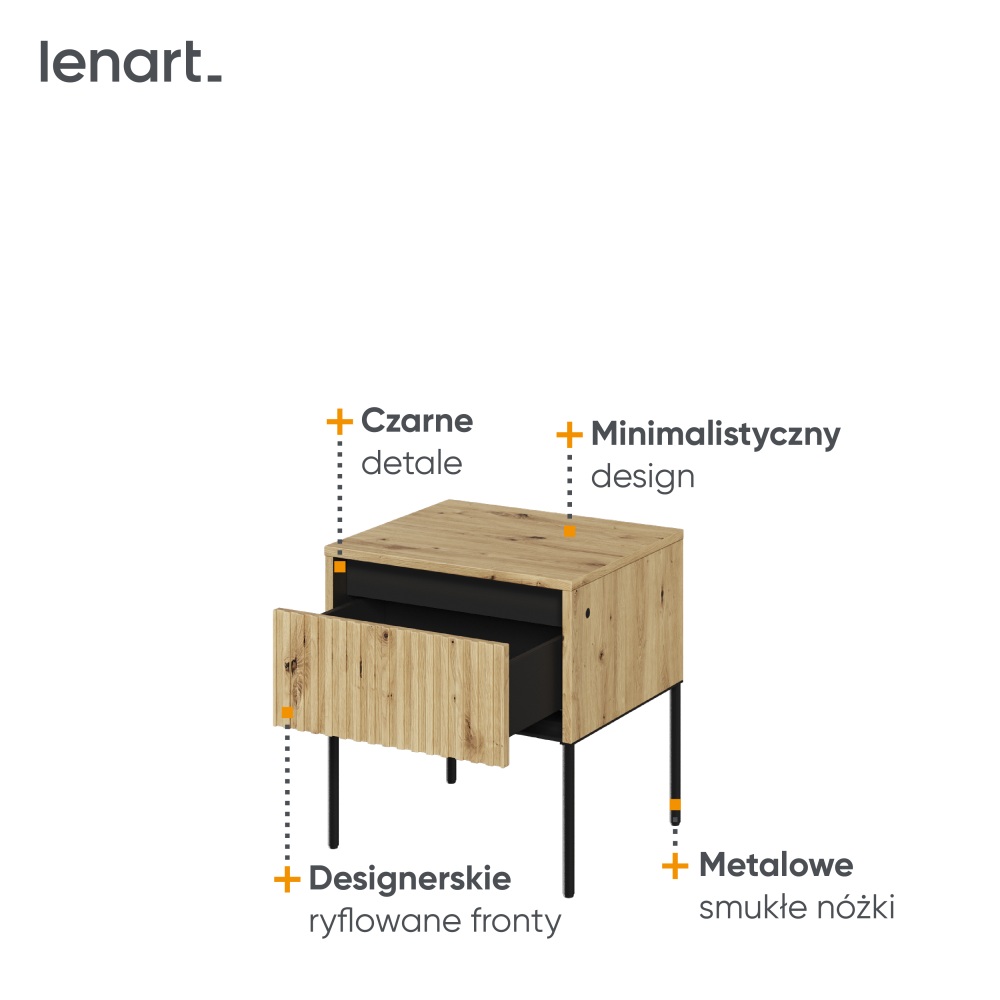 Stolik nocny w kolorze drewna dąb artisan z ryflowanym frontem to stylowy akcent, który przyciąga wzrok i dodaje wnętrzu wyjątkowego charakteru. Czarne detale podkreślają jego elegancki design, nadając mu nowoczesny, wyrafinowany wygląd. Smukłe, metalowe nóżki zapewniają konstrukcji lekkość oraz stabilność, idealnie komponując się z minimalistyczną formą mebla. Stolik jest wyposażony w praktyczny system push-open, co ułatwia dostęp do schowka i eliminuje konieczność stosowania uchwytów, podkreślając nowoczesny styl. W zestawie znajduje się także oświetlenie LED, które delikatnie rozświetla ryflowany front, tworząc przytulną atmosferę. To połączenie estetyki i funkcjonalności sprawia, że stolik nocny będzie idealnym dopełnieniem sypialni, łącząc praktyczne rozwiązania z wyjątkowym designem.