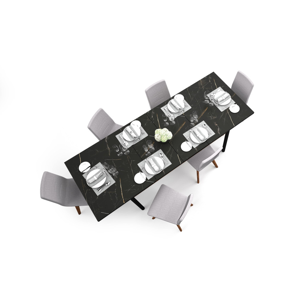 Zestawienie matowego czarnego koloru nóg z laminowaną płytą w dekorze orzech warmia i marmurowym blatem w kolorze san sebastian nadaje kolekcji niepowtarzalny wygląd i niezwykłość wzoru.