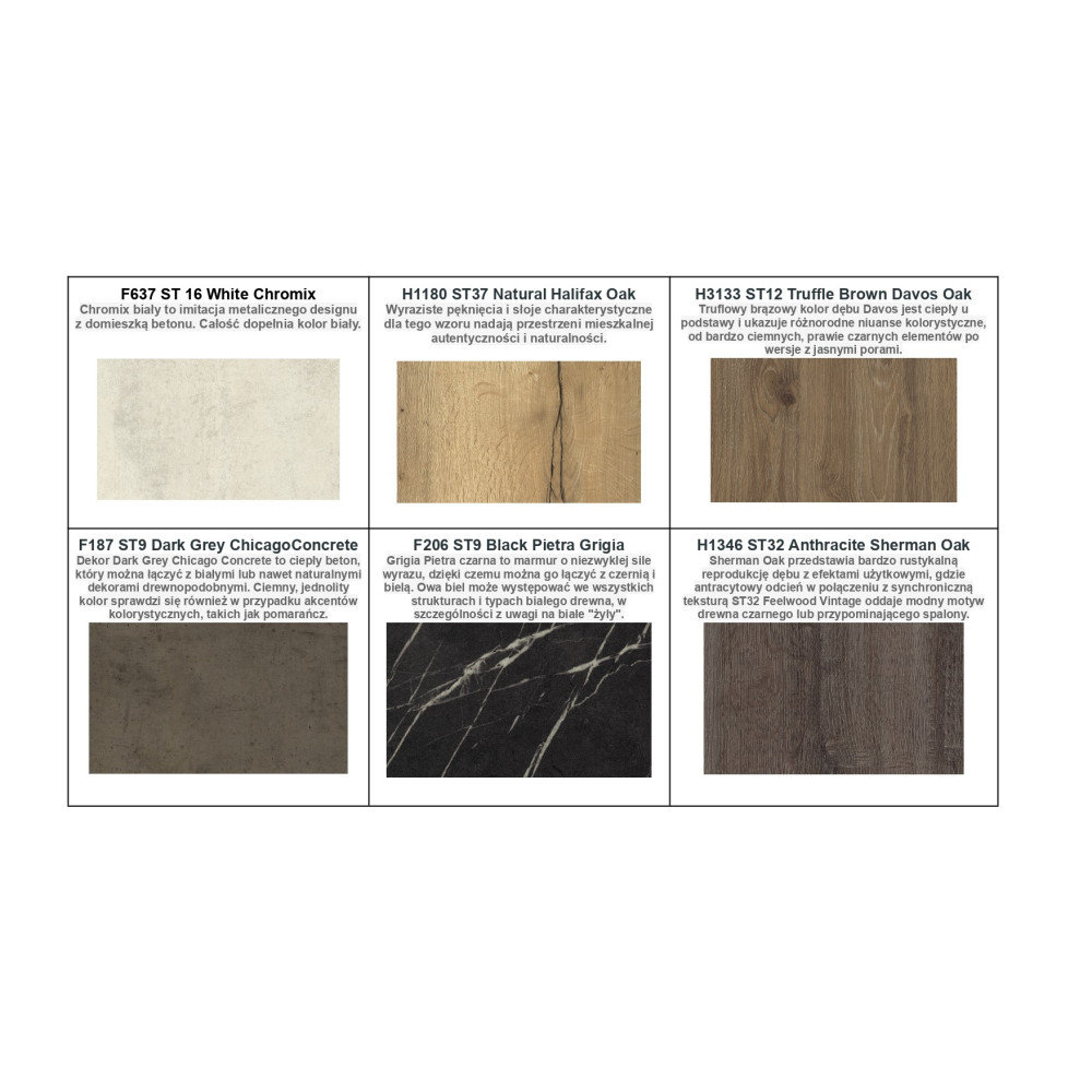 Do wyboru 10 dekorów blatu marki Phleiderer oraz 6 dekorów marki Egger.