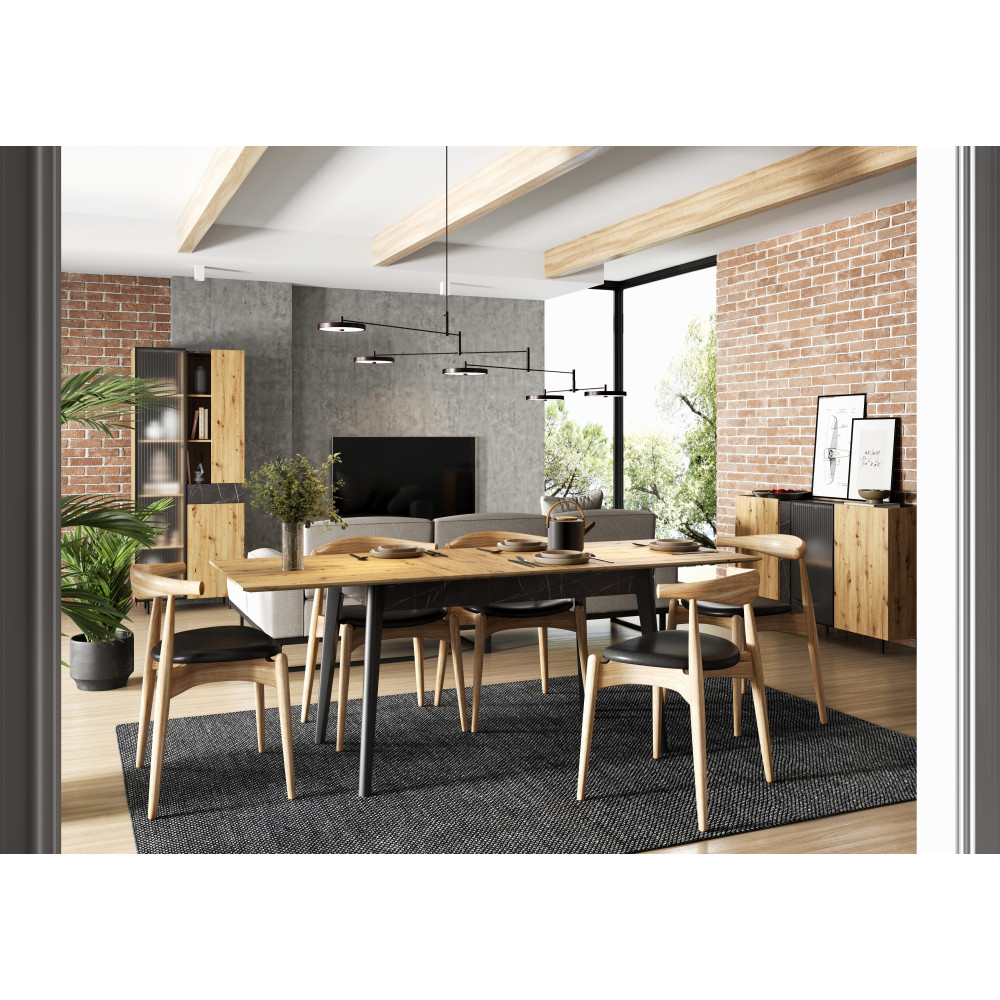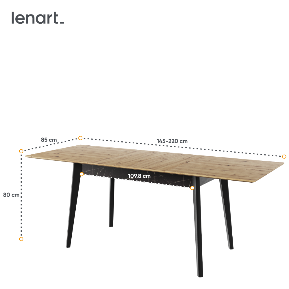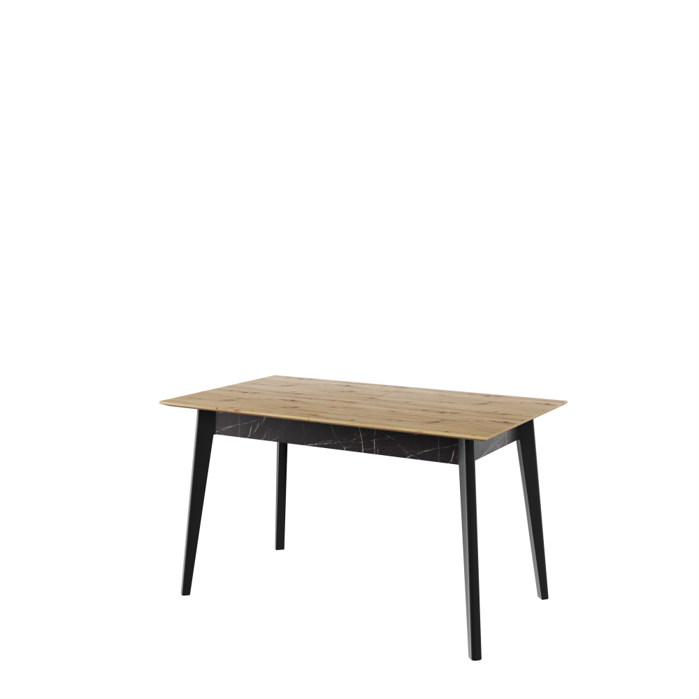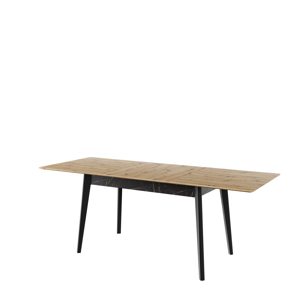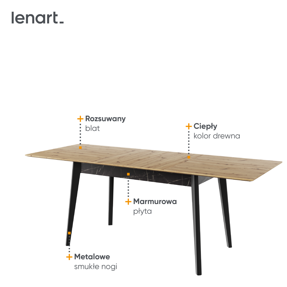 Stół do jadalni to doskonałe połączenie stylu i praktyczności, idealny do każdego wnętrza. Jego rozkładana konstrukcja umożliwia wygodne ugoszczenie większej liczby gości, co czyni go idealnym rozwiązaniem na różne okazje. Smukłe metalowe nóżki nadają mu lekkości, a subtelny blat w połączeniu z efektownymi marmurowymi akcentami sprawia, że stół doskonale komponuje się zarówno w klasycznych, jak i nowoczesnych aranżacjach. To mebel, który łączy elegancję z funkcjonalnością, stając się sercem każdej jadalni.