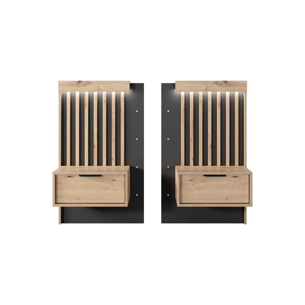 - stoliki nocne o wymiarach szerokość 50,4 cm + 50,4 cm, wysokość 104 cm, głębokość 39,6 cm. Są idealnym miejscem do przechowywania przedmiotów, które chcemy mieć pod ręką w trakcie odpoczynku.