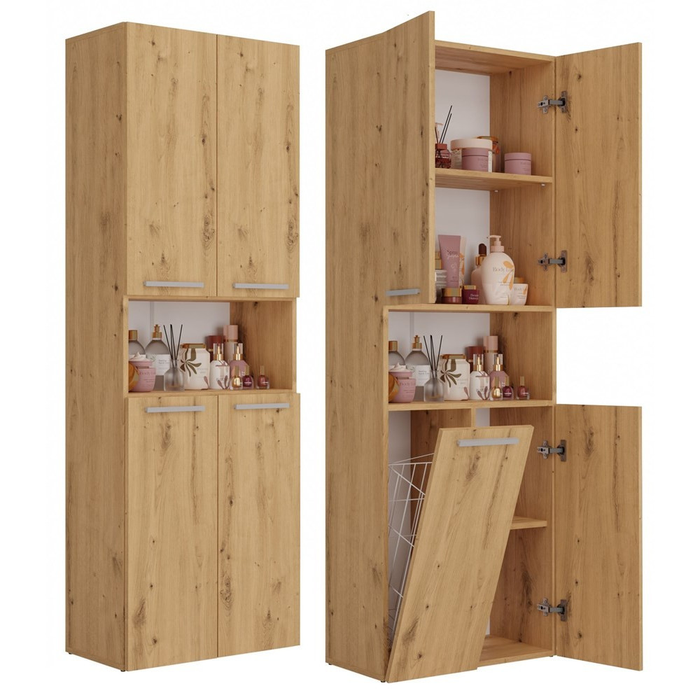 • Szafka posiada 5 praktycznych (4 zamykane, 1 otwarta) półek oraz kosz
