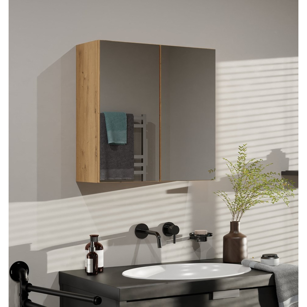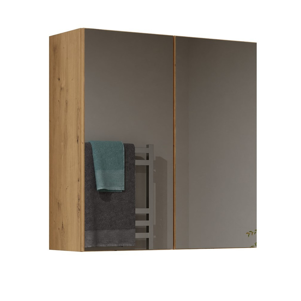 • Wyposażona w 3 praktyczne półki schowane za stylowymi drzwiczkami z lustrzanym frontem.