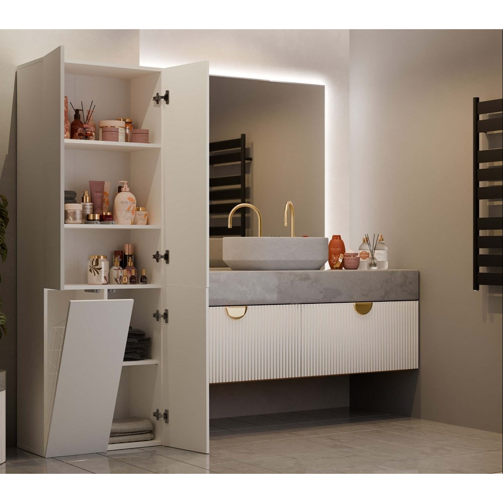 • Szafka wyposażona w 5 zamykanych półek oraz praktyczny kosz, idealny na przechowywanie bielizny lub ręczników.