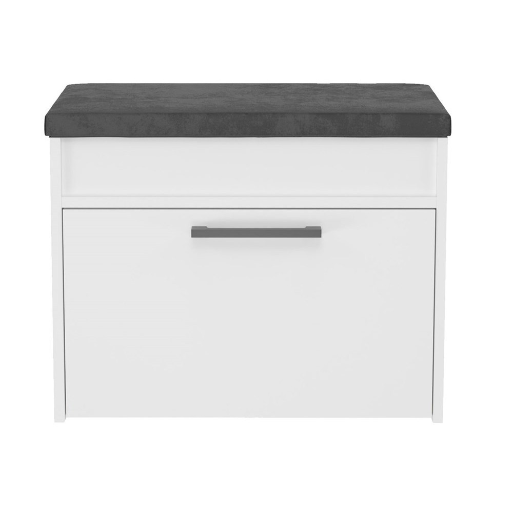Komfortowa szafka na obuwie z tapicerowanym siedziskiem oraz schowkiem na gadżety. Szafka posiada uchylne drzwi za którymi znajduje się półka.