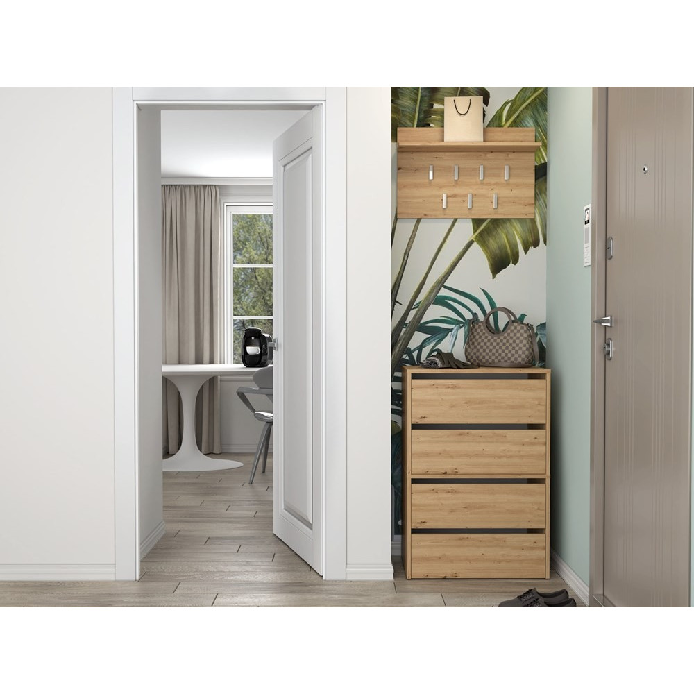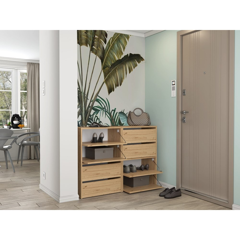 • Za drzwiczkami znajdują sie 4 pojemne półki na obuwie