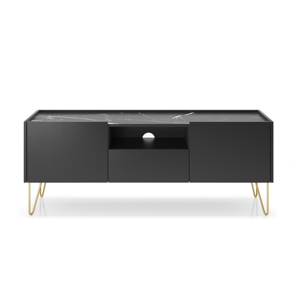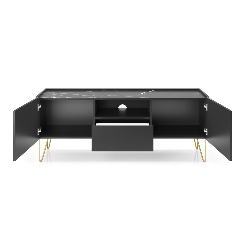 Nowoczesna szafka RTV w kolorze czarny grafit + marmur black royal to mebel, który łączy w sobie elegancję czerni z naturalnym pięknem marmuru, tworząc harmonijną i wyrafinowaną estetykę.