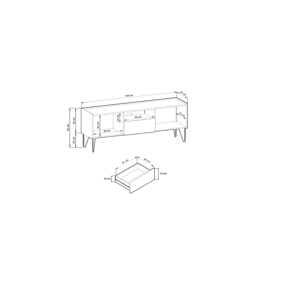 Ta nowoczesna szafka RTV jest idealnym rozwiązaniem do przechowywania sprzętu elektronicznego i dodatków w salonie czy pokoju dziennym. Jej designerski wygląd i wysokiej jakości wykonanie sprawiają, że staje się ona atrakcyjnym elementem wystroju wnętrza, jednocześnie będąc funkcjonalnym meblem.