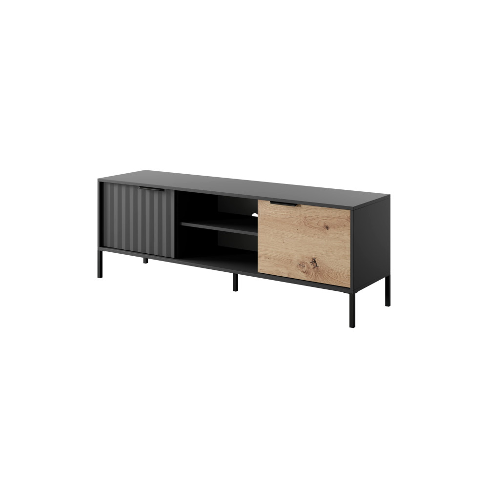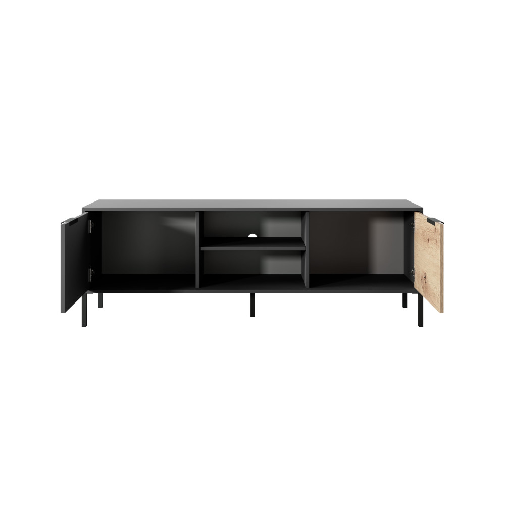 Front szafki RTV składa się z płyty wiórowej laminowanej E05 o grubości 16 mm, uzupełnionej o dąb artisan. To połączenie czerni i naturalnego drewna nadaje meblowi wyjątkowego charakteru, tworząc harmonijne połączenie kolorów i materiałów.