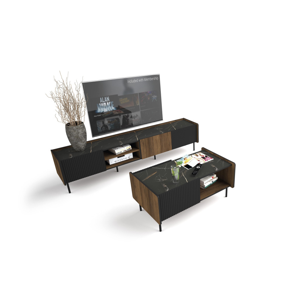 Zestawienie matowego czarnego koloru frontów z laminowaną płytą w dekorze orzech warmia i marmurowym blatem w kolorze san sebastian nadaje kolekcji niepowtarzalny wygląd i niezwykłość wzoru.