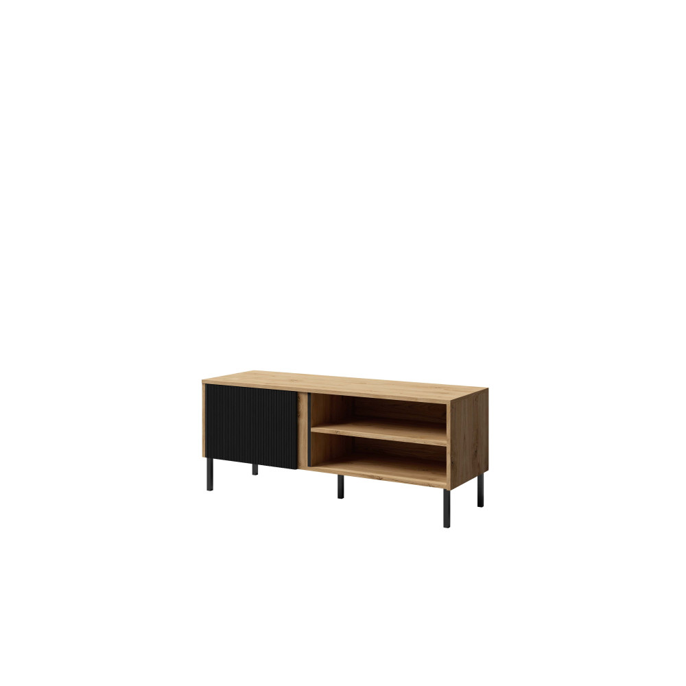 Dzięki zastosowaniu płyty laminowanej, szafka RTV jest odporna na zarysowania i uszkodzenia mechaniczne, co zapewnia jej długotrwałą użyteczność. Tył szafki wykonany jest z płyty HDF, co dodaje stabilności całej konstrukcji.