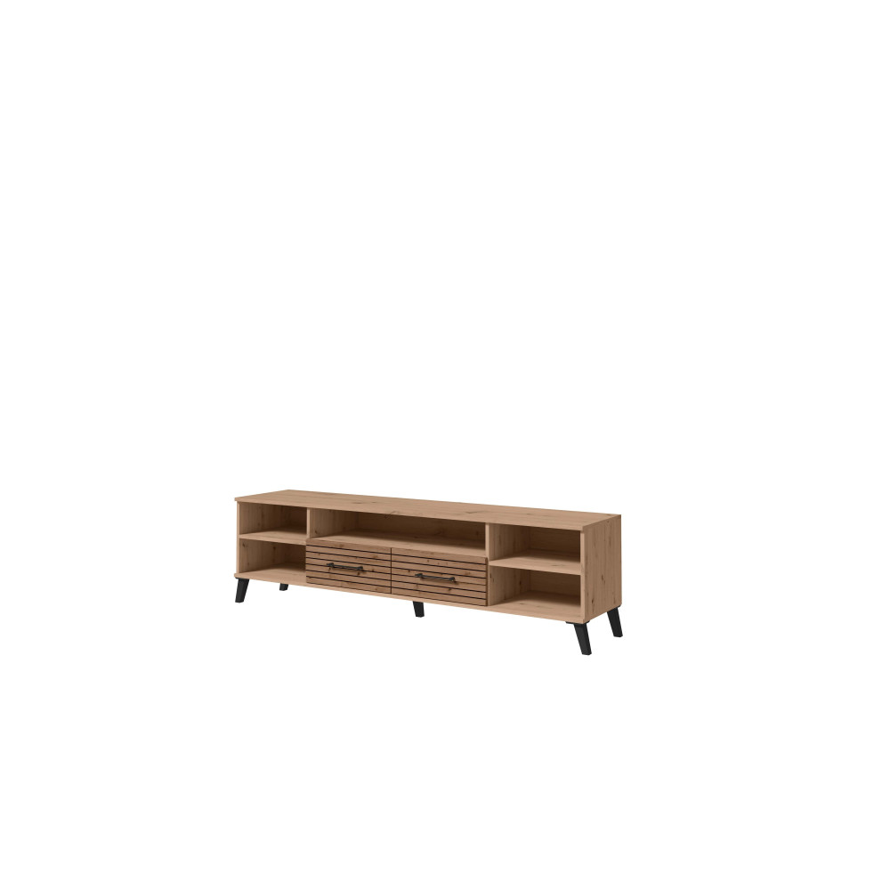 Tył szafki RTV wykonany z HDF dodatkowo wzmacnia konstrukcję, zapewniając stabilność i trwałość mebla. Dzięki temu szafka RTV zachowuje swoją formę nawet przy intensywnym użytkowaniu.
