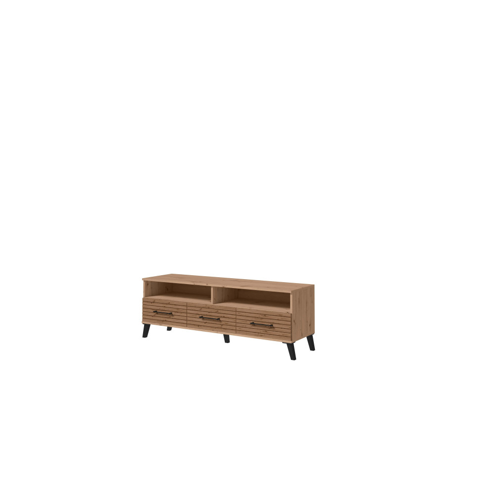 Szafka RTV Tora cechuje się solidną konstrukcją z wysokiej jakości płyty laminowanej, która zapewnia trwałość i łatwość w utrzymaniu czystości. Dzięki zastosowaniu tej materiałów, szafka RTV jest odporna na zarysowania i uszkodzenia mechaniczne, co sprawia, że będzie służyć przez wiele lat.
