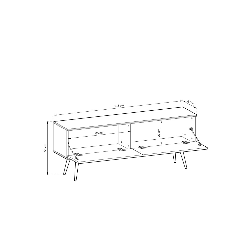 Jej wymiary, o szerokości 135 cm, wysokości 30 cm i głębokości 32 cm, sprawiają, że jest idealna do przechowywania urządzeń elektronicznych, systemów audio-wideo oraz różnych akcesoriów. Dzięki swojej kompaktowej formie, szafka doskonale sprawdzi się nawet w pomieszczeniach o ograniczonej przestrzeni.