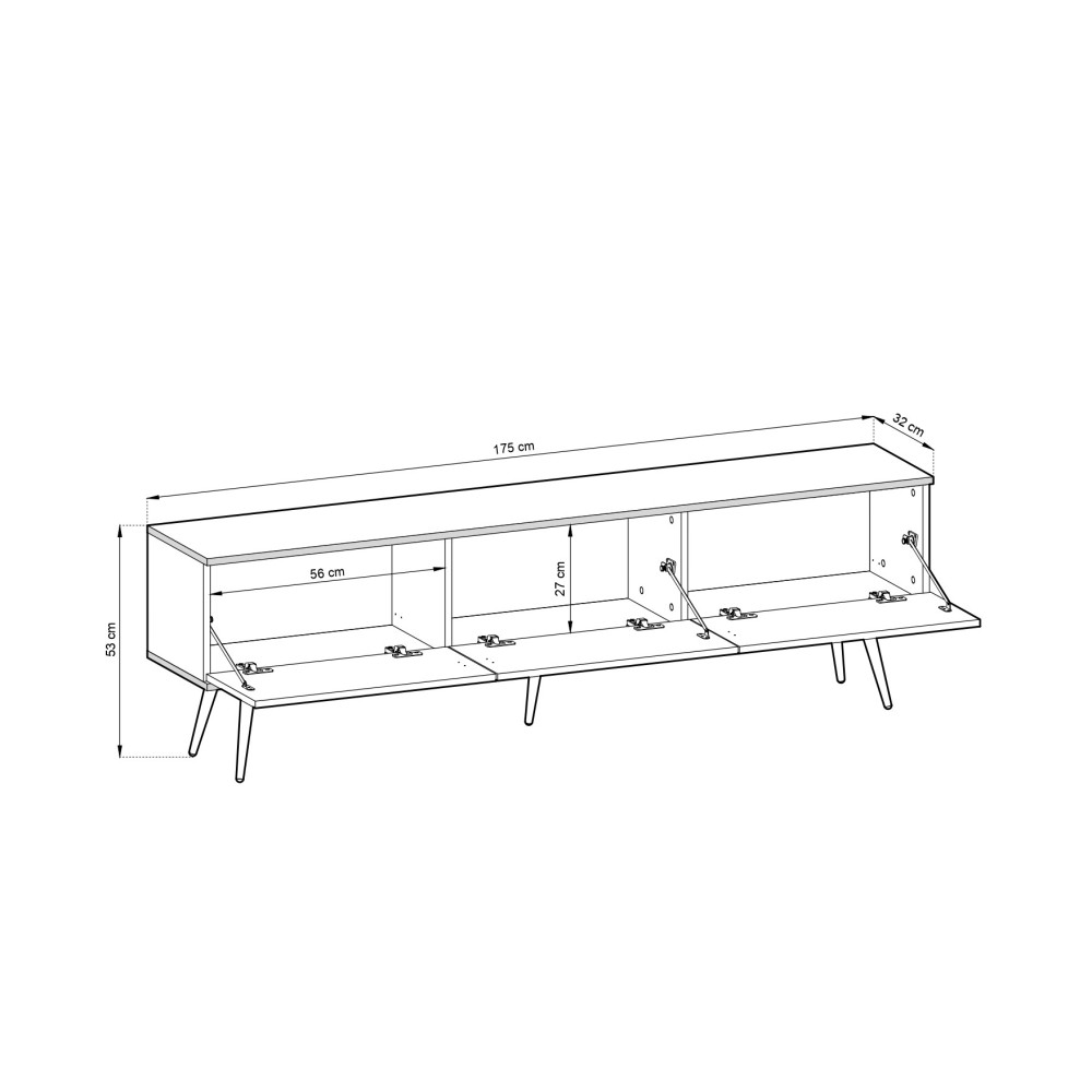 Jej wymiary, o szerokości 175 cm, wysokości 30 cm i głębokości 32 cm, sprawiają, że jest idealna do przechowywania urządzeń elektronicznych, systemów audio-wideo oraz różnych akcesoriów. Dzięki swojej kompaktowej formie, szafka doskonale sprawdzi się nawet w pomieszczeniach o ograniczonej przestrzeni.