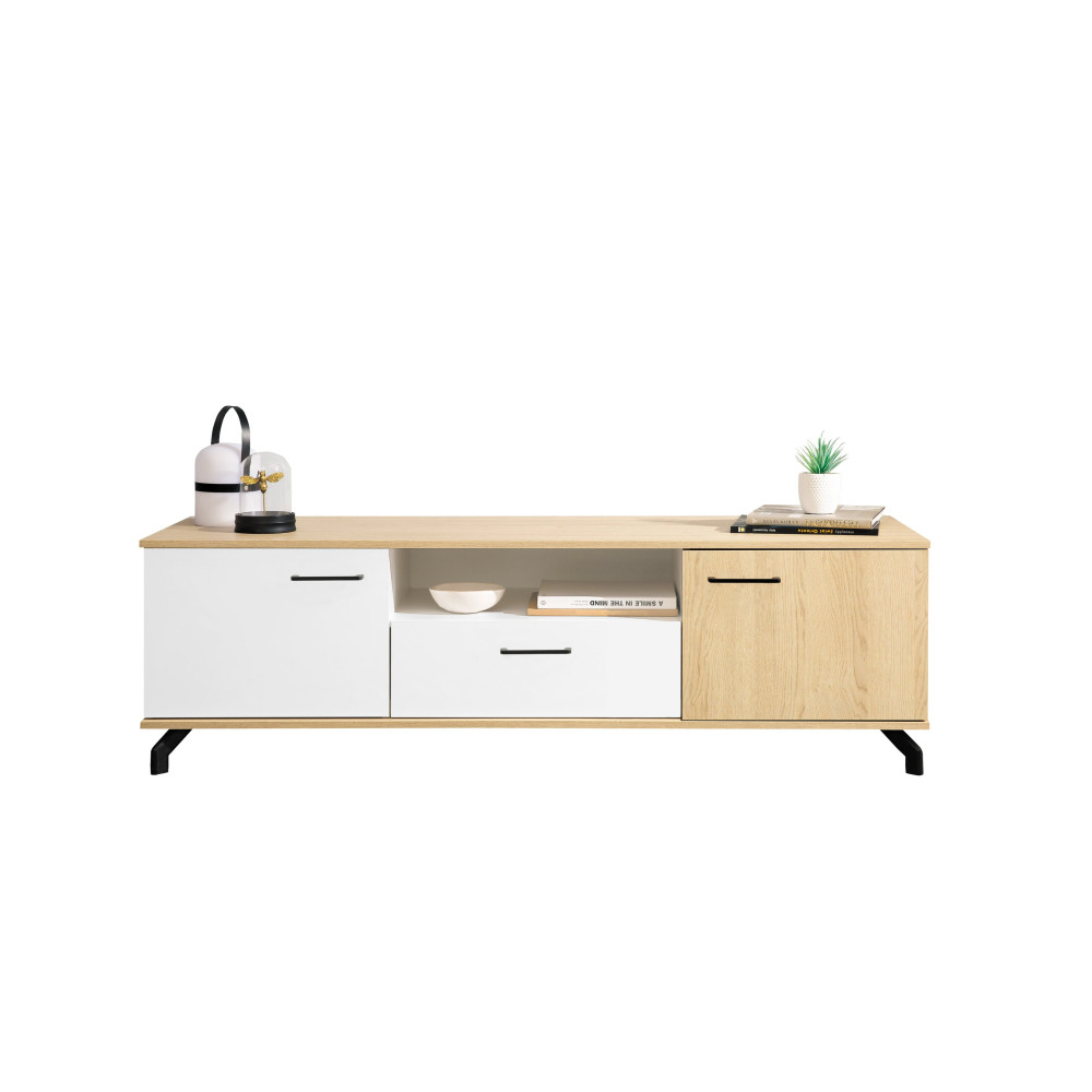 System meblowy Marsylia to kompleksowy zestaw mebli, który cechuje się nowoczesnym designem oraz wysoką funkcjonalnością. Głównym materiałem używanym do produkcji tych mebli jest płyta laminowana o odcieniach kolorystycznych Dąb Biszkoptowy/Biały lub Dąb Biszkoptowy/Czarny.