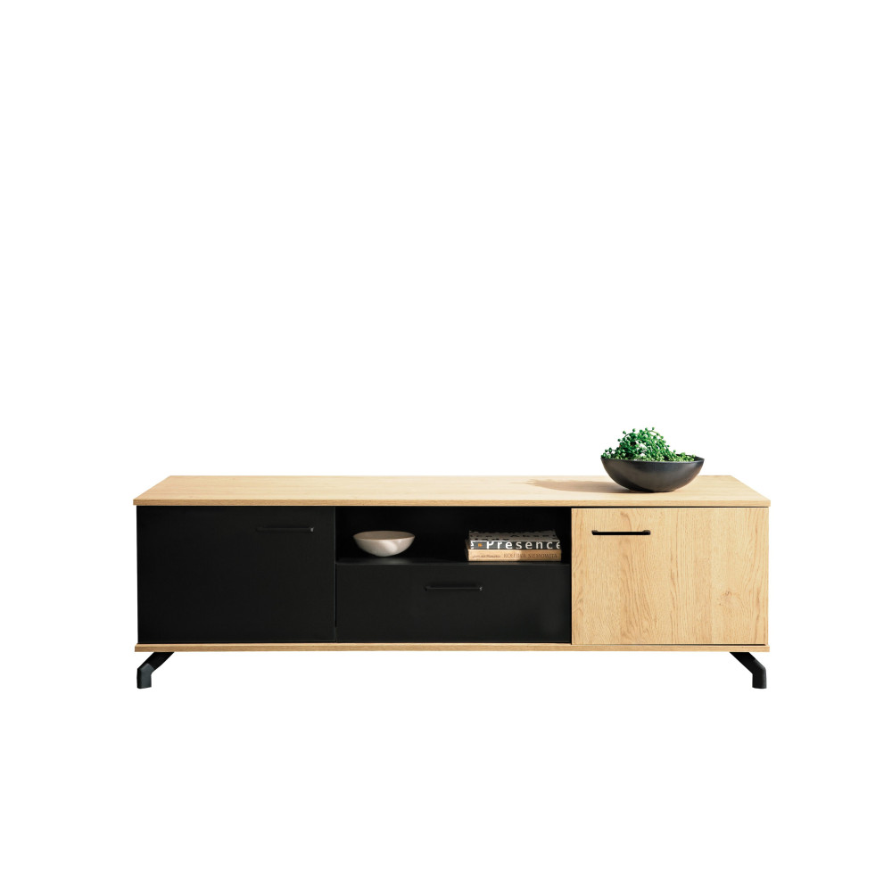 System meblowy Marsylia to kompleksowy zestaw mebli, który cechuje się nowoczesnym designem oraz wysoką funkcjonalnością. Głównym materiałem używanym do produkcji tych mebli jest płyta laminowana o odcieniach kolorystycznych Dąb Biszkoptowy/Biały lub Dąb Biszkoptowy/Czarny.