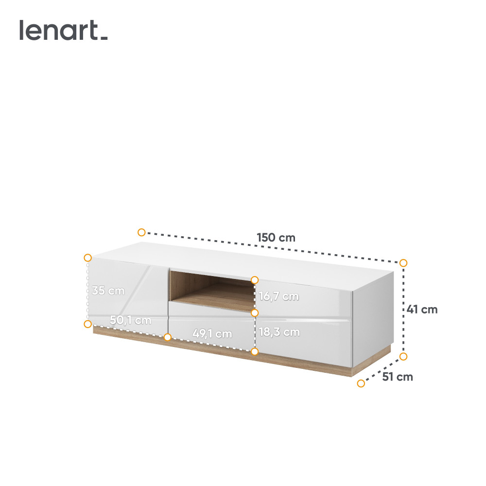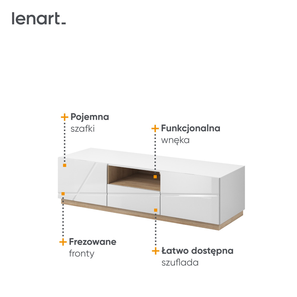 Szafka RTV w minimalistycznym stylu to elegancka propozycja dla nowoczesnych wnętrz, łącząca połyskującą biel z naturalnymi akcentami drewna w kolorze dąb Riviera. Jej prosta, geometryczna forma z oryginalnymi frezowaniami na frontach nadaje wnętrzu subtelnej elegancji i harmonii.