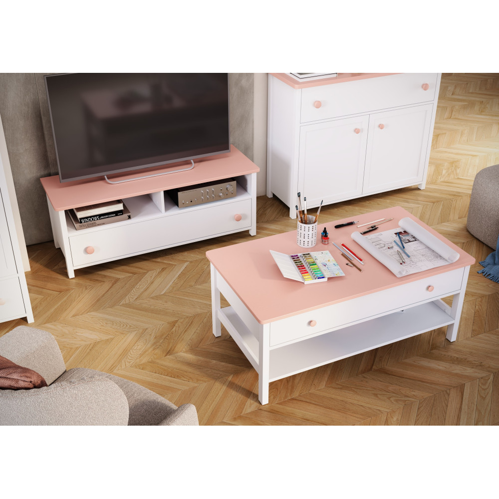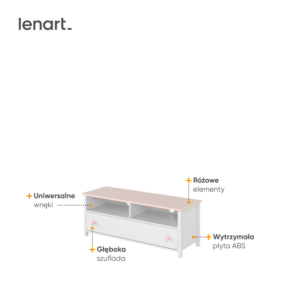 Szafka RTV w białym kolorze z różowymi detalami to elegancki i funkcjonalny mebel, idealny do nowoczesnych wnętrz. Wyposażona w jedną pojemną szufladę oraz dwie wnęki, oferuje doskonałe miejsce na sprzęt multimedialny i dekoracje.
