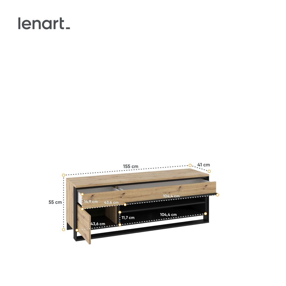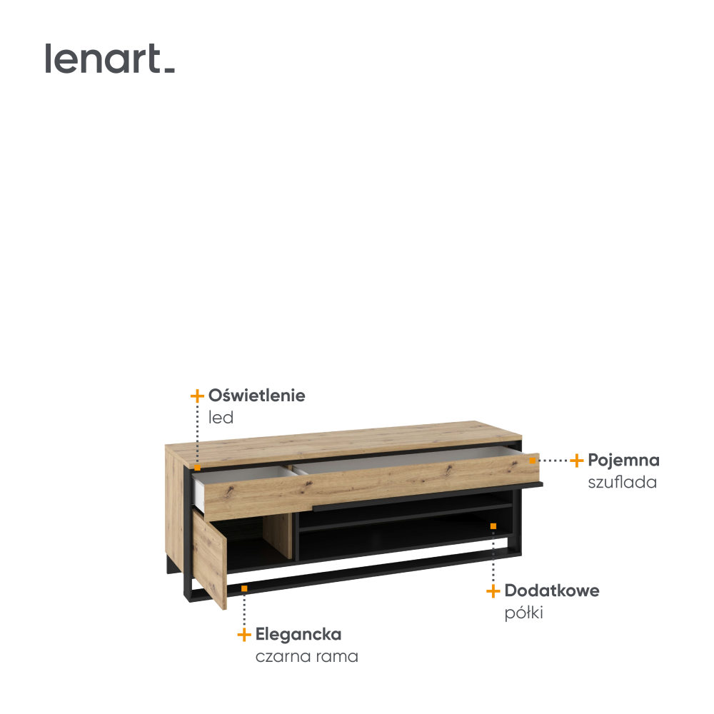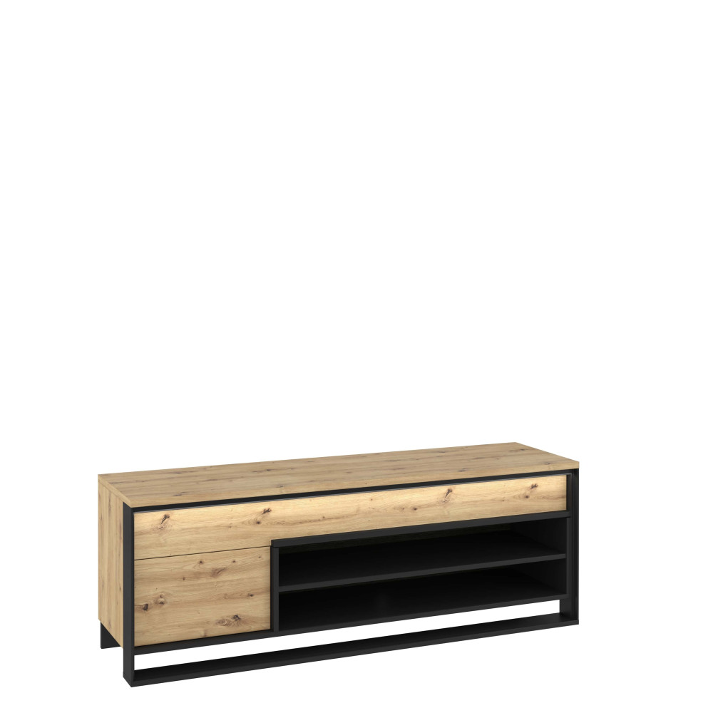 Szafka RTV to idealne rozwiązanie dla osób poszukujących stylowego i funkcjonalnego mebla do strefy rozrywkowej. Oferuje przestronne wnętrze z dwiema wnękami, pojemną szufladą oraz szafką z drzwiami, co sprzyja utrzymaniu porządku i organizacji wszystkich akcesoriów RTV. Nowoczesny design podkreśla atrakcyjny dekor drewna dębu artisan oraz smukła czarna podpora, nadając meblowi elegancki charakter. Dodatkowo, komfortowe użytkowanie zapewnia mechanizm PUSH TO OPEN, co sprawia, że korzystanie z szafki jest wyjątkowo wygodne i estetyczne.